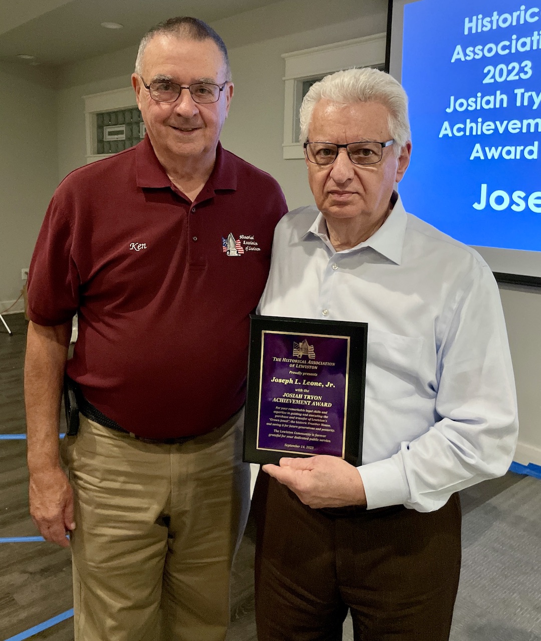 •The Josiah Tryon Achievement Award was presented to Leone, who provided remarkable legal work during the complicated negotiations to acquire and transfer the Frontier House property.