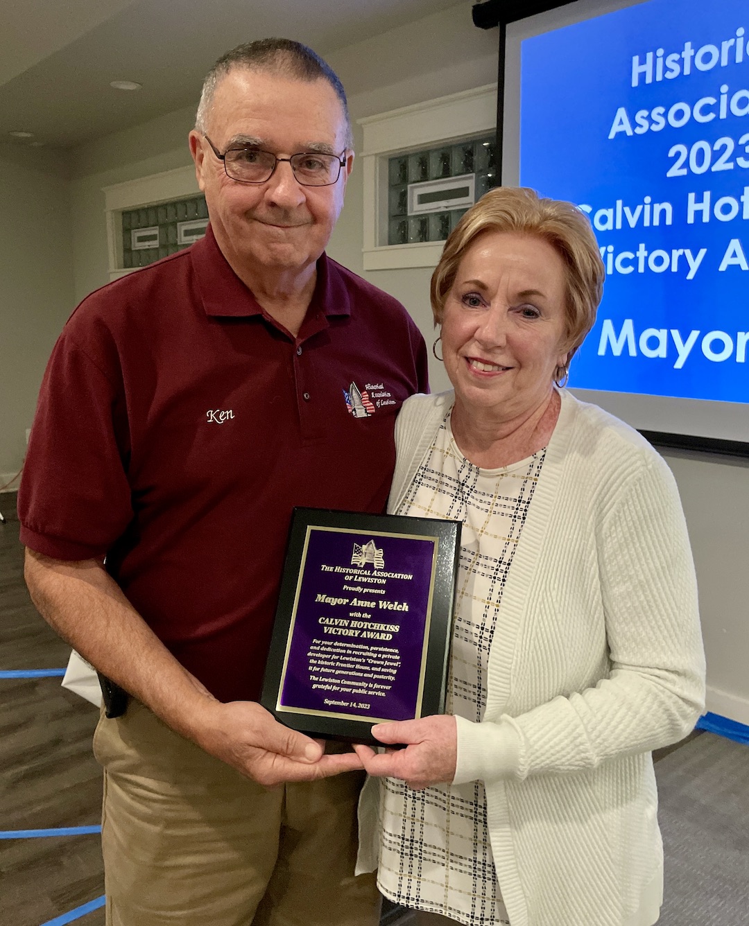 •The Calvin Hotchkiss Victory Award was given to Mayor Anne Welch for her successful efforts in recruiting a private developer who would take over the purchase agreement and invest the funds necessary to restore the Frontier House and keep it on the tax rolls.
