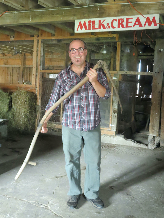 In the barn, Dave Reilly exhibits one of the farm tools that may have been used on the Alt Farmstead.