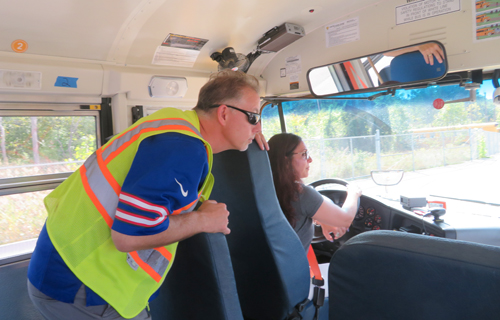 Keith Gipp guides Tara Gipp through her test drive. This was her first time behind the wheel of a school bus.