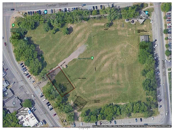 Fittante Architecture principal Jim Fittante designed the pavilion rendering. He noted the park has 249,559 square feet – more than 5 acres of green space. The new structure would only take up 2.5% of that park land – less than the Lewiston Academy schoolhouse used when it sat on the site in 1824.