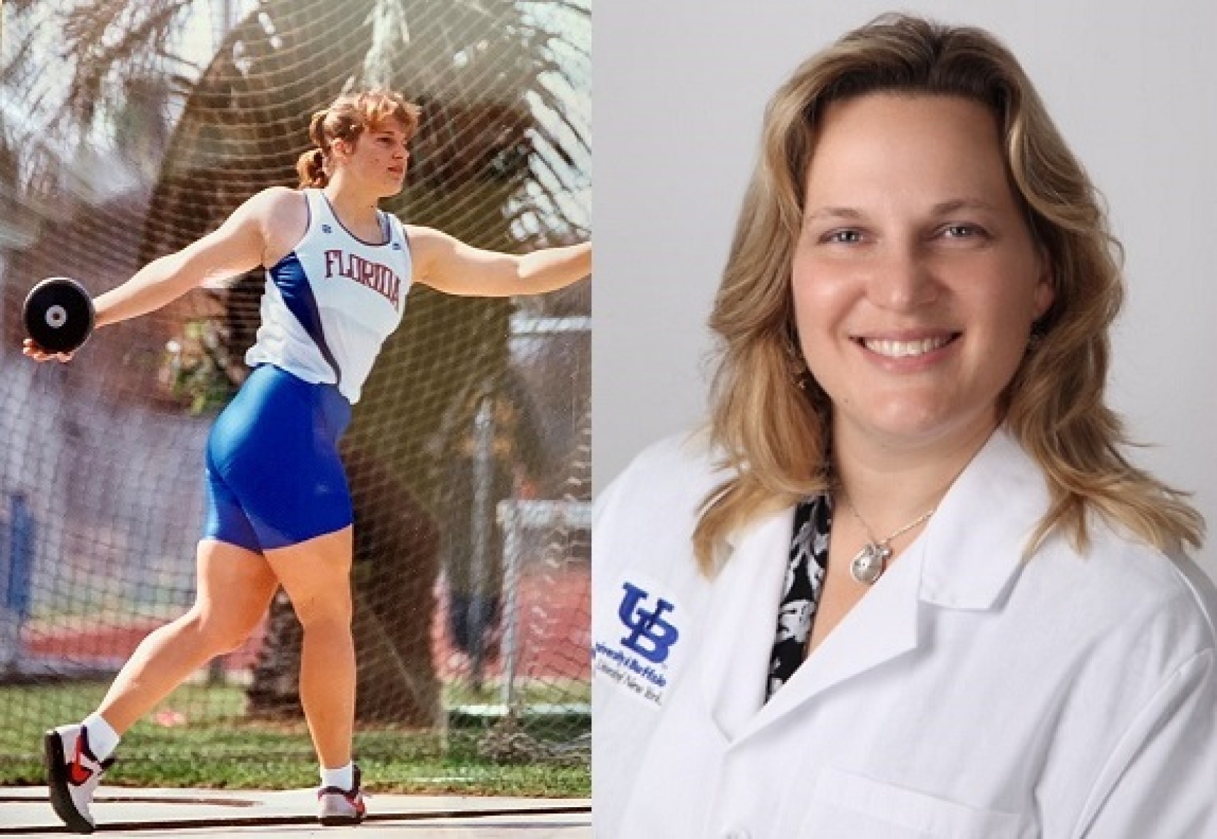 Dr. Stacey Schroeder-Watt, seen then and now. In the photo on the left, she is seen throwing a discus while a student at the University of Florida. As a student at Grand Island High School, she was No. 1 in the nation in discus throwing and No. 3 nationally in shot put. In photo at right, she is seen in her office. She is chief of service for anesthesiology at Kaleida Health. She also holds the post as interim chair of the anesthesiology department at the University at Buffalo’s Jacobs School of Medicine and Biomedical Sciences. (Submitted photos)