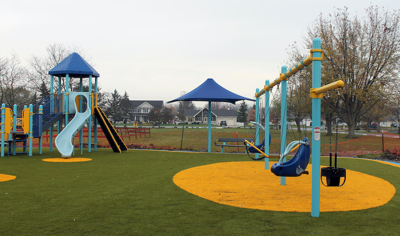 Doktor pointed to some special features, including an extra-wide ramp that can easily fit both a wheelchair going up and a wheelchair coming down; a tandem swing; the blue and yellow of the playground equipment, which are Wheatfield town colors; and turf that has a special supportive feel from its thick, low-impact quality.
