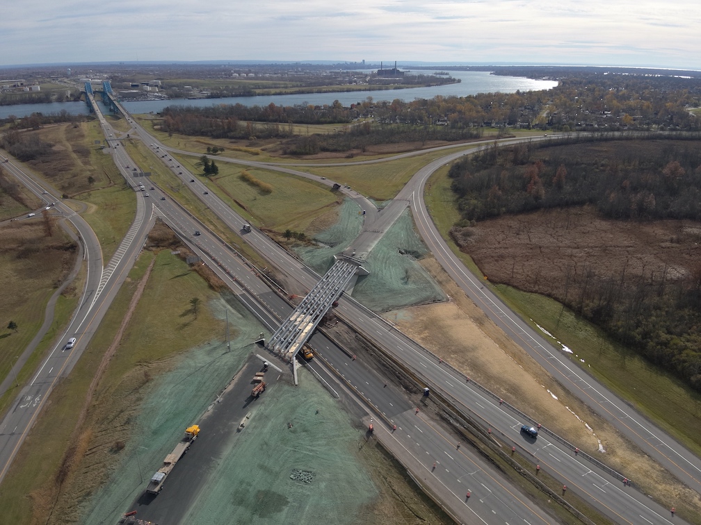 The installation marks a significant point in progress toward restoration of an important commuter route carrying traffic over the I-190 and onto Beaver Island Parkway.