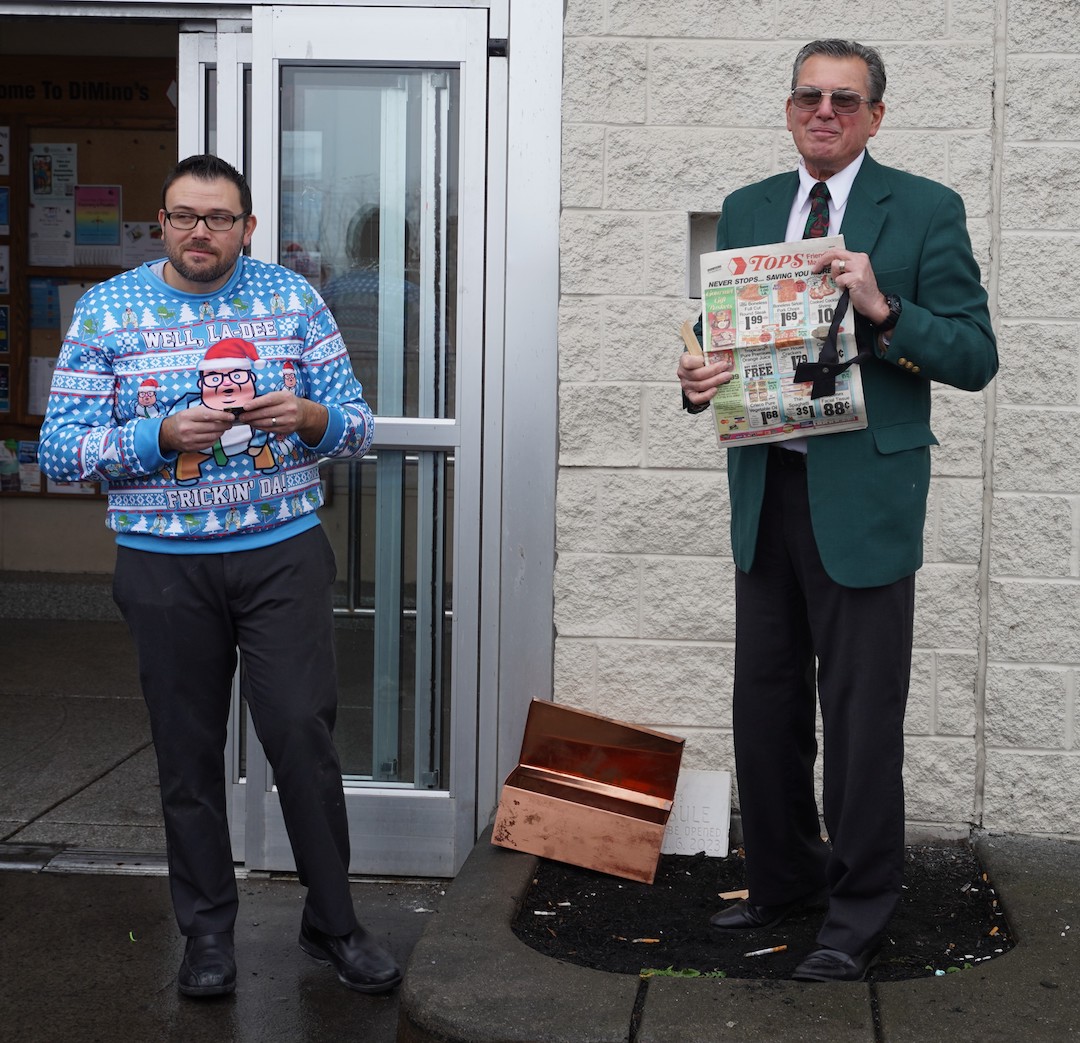John and Anthony DiMino pull out a time capsule to mark 25 years since the current, larger DiMino’s Lewiston Tops supermarket debuted. Items inside the time capsule included a store circular ad, an employee uniform tie, and some student/Cub Scout photos. (Photo by Joshua Maloni)