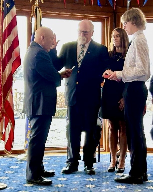 Peter Marston Jr. is sworn in as Grand Island supervisor by New York State Assemblyman Angelo Morinello, left. Marston stands next to his wife, Sue, as his son, Pete III, holds the Bible. (Photo courtesy of the Town of Grand Island)