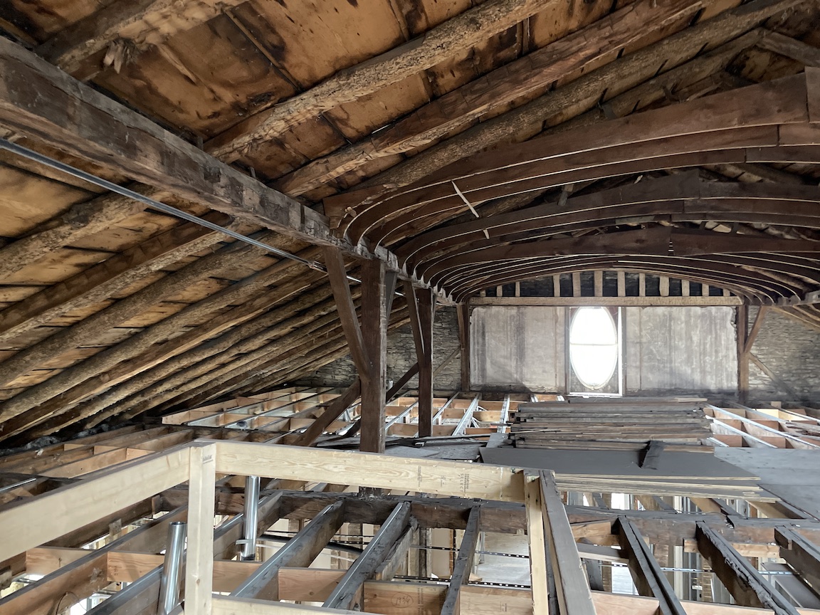“These (floorboards) will all be put back in. The historic barrel-vaulted ceiling will be reformed just as it was historically. When we came up here initially, before we started doing the demo up here, the ceiling was caving in in sections. The lathe was all beaten up and it was falling. We’ll reframe all that and reboard it to match the original look.”