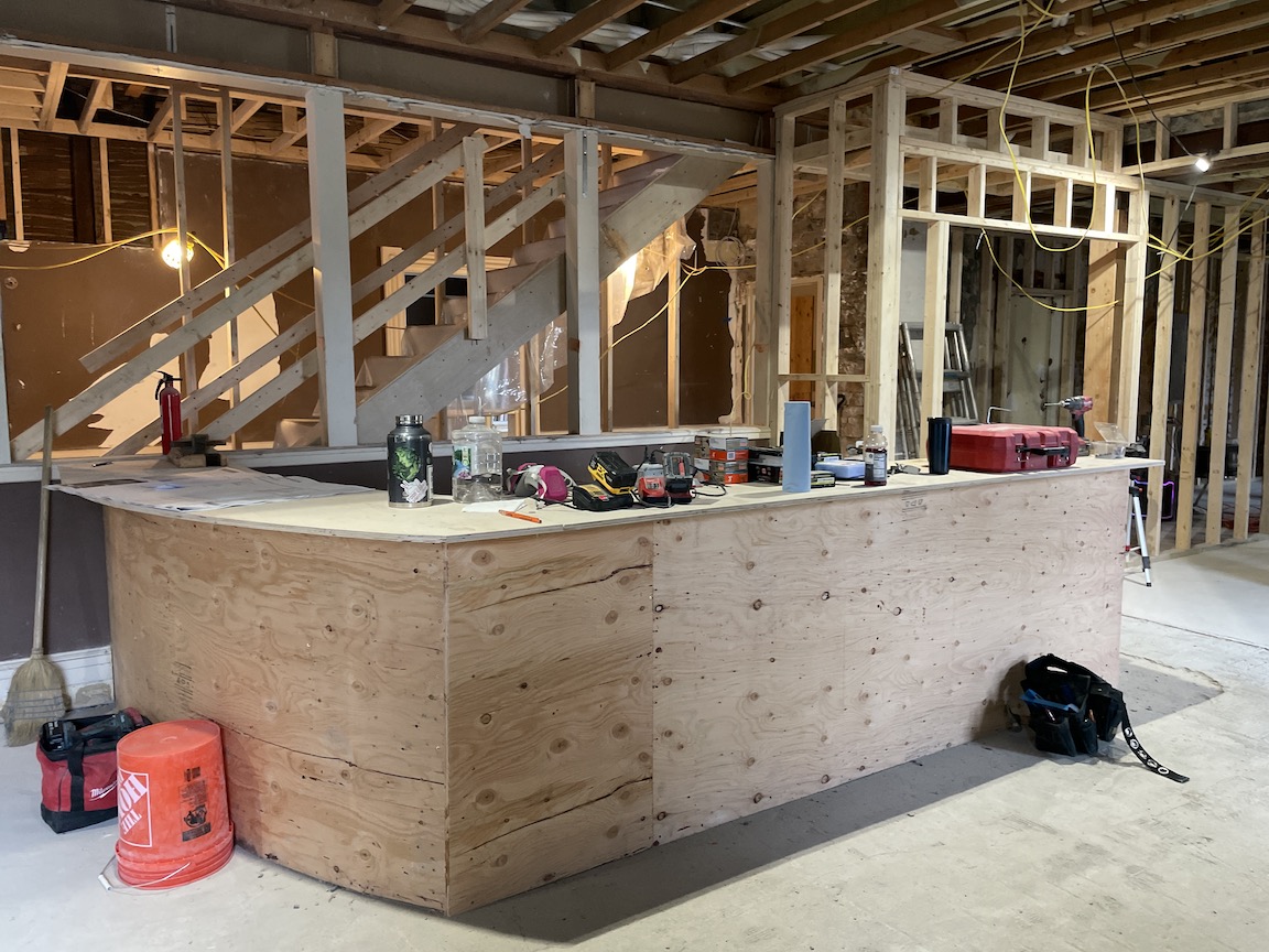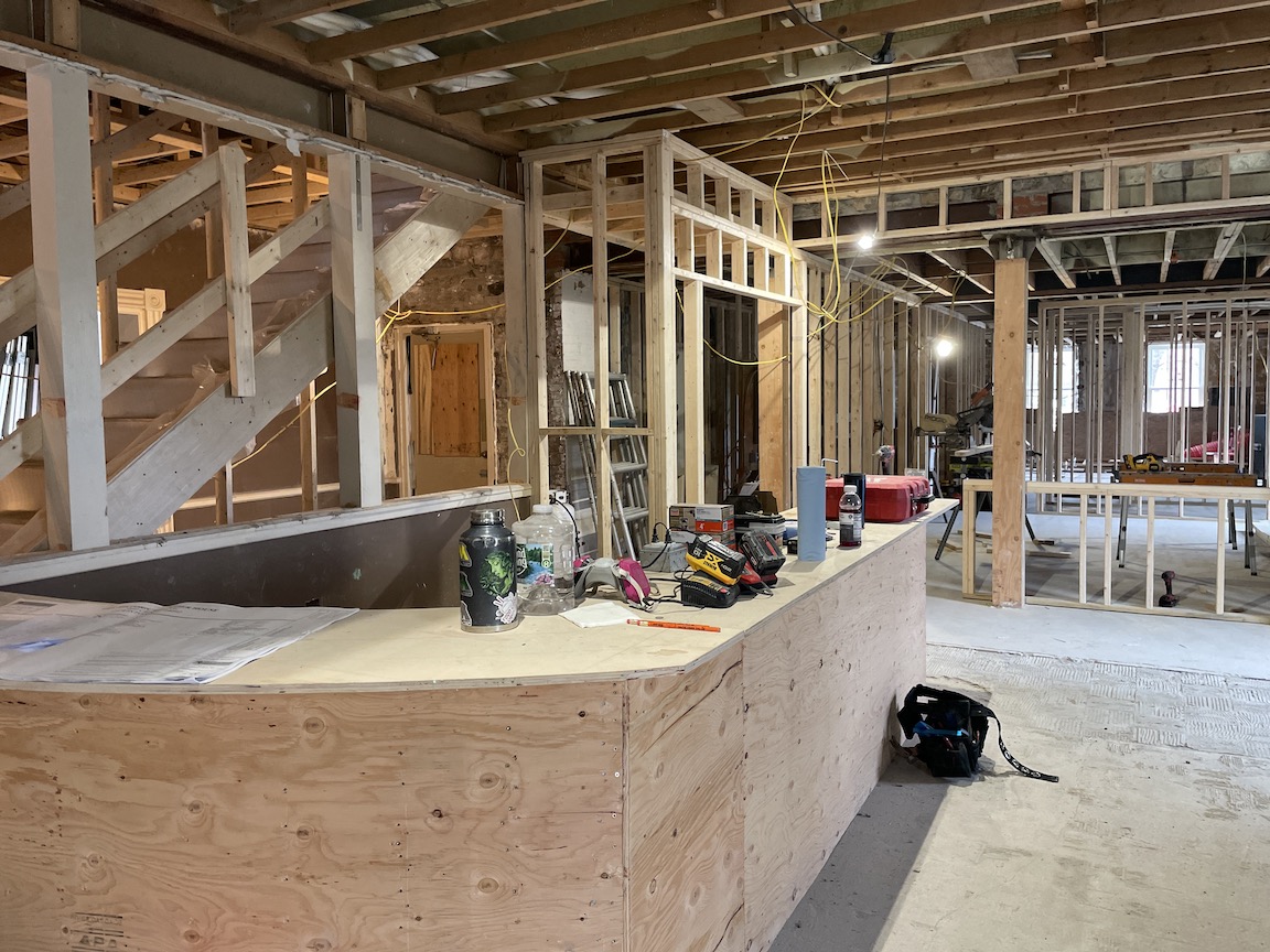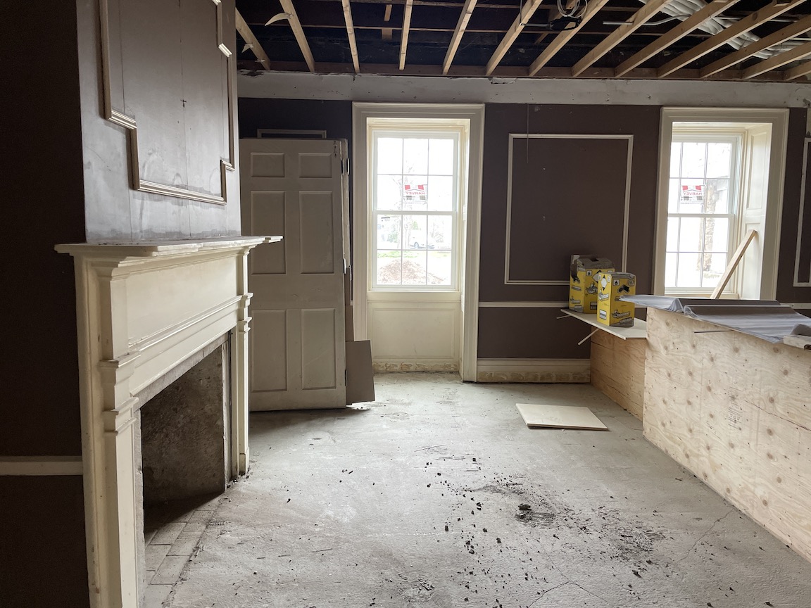 He explained the former first-floor tiles were removed and will be replaced with hardwood to match the upper levels. The outline of a new serving hallway is visible, and will connect the open kitchen to new restrooms and a new wall of windows/new ADA-compliant porch entrance facing into the parking lot.