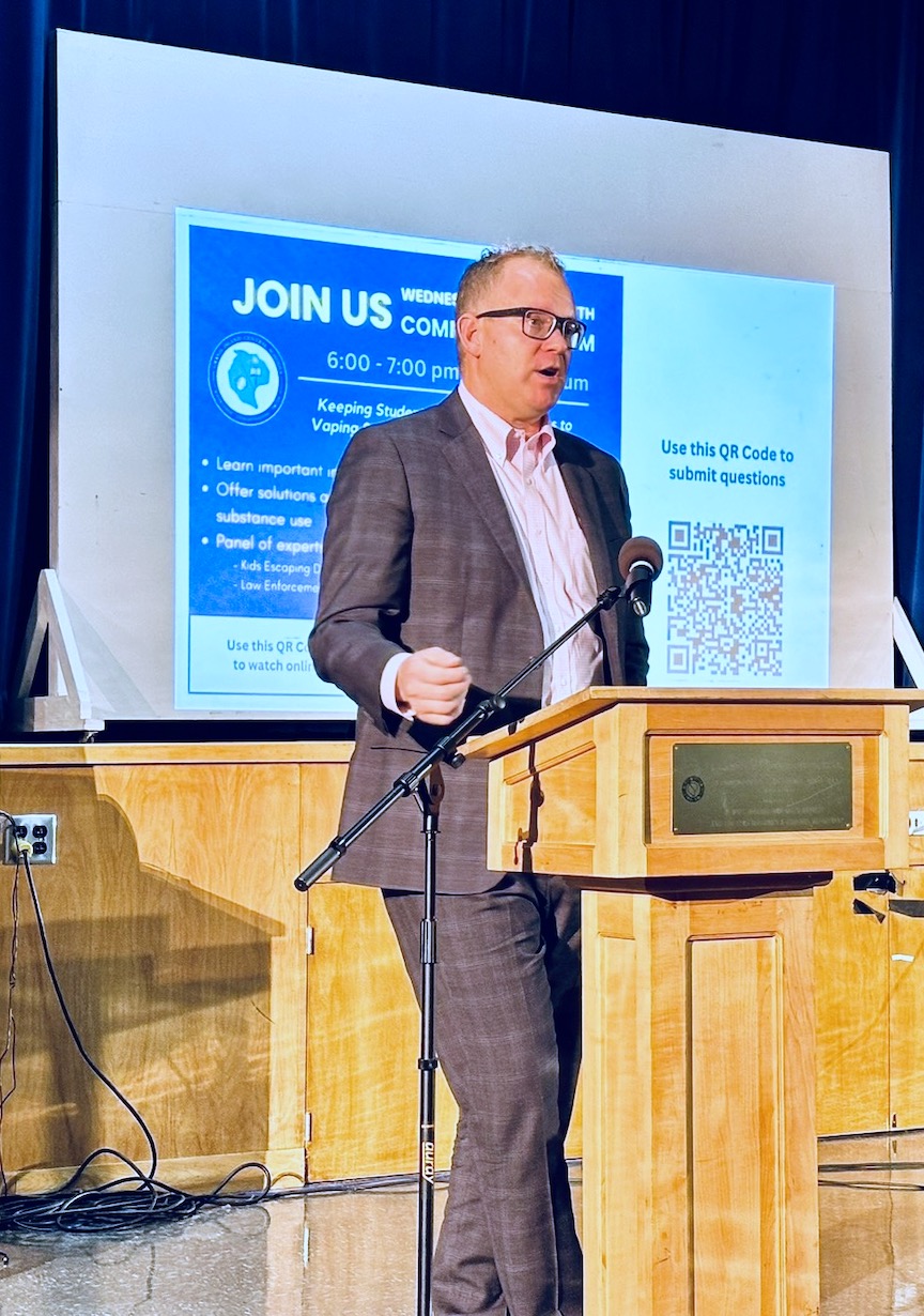 Dr. Joshua Lynch, a leader and expert in the areas of emergency medicine and treatment of opioid use disorder, presents at the forum. (Photo courtesy of the Grand Island Central School District)