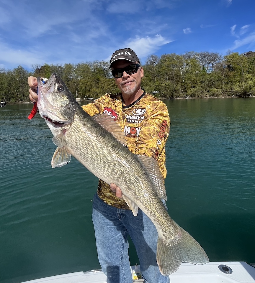 Mark Davis, host of “BigWater Adventures,” shows off a giant, 34-inch walleye he caught while filming an episode of his show for 2025.