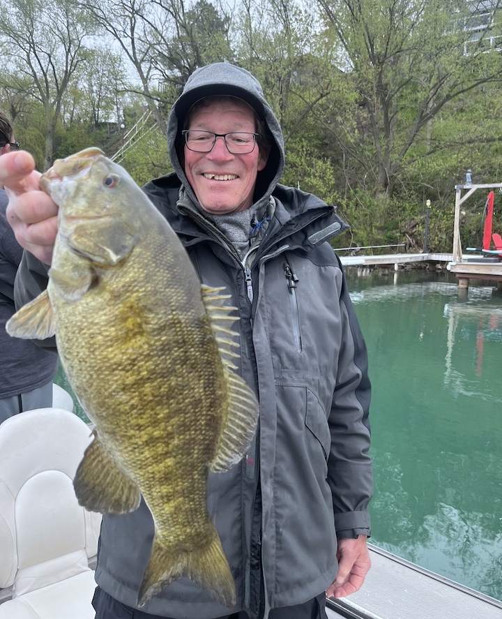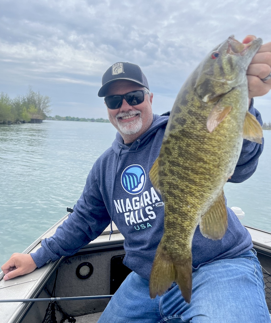 In-Fisherman Field Editor Steve Quinn hoists a beautiful lower Niagara River smallmouth bass.