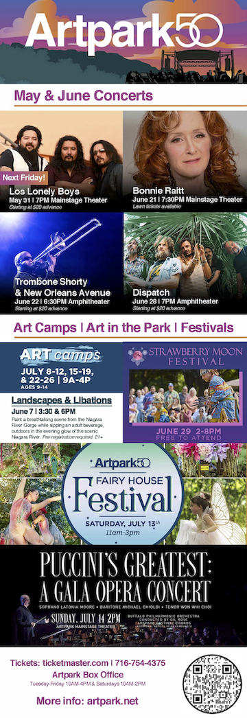 Please check our website at www.artpark.net for a full list of programs planned. Also, watch for future columns in this publication that will take you behind-the-scenes at Artpark and the live entertainment business.