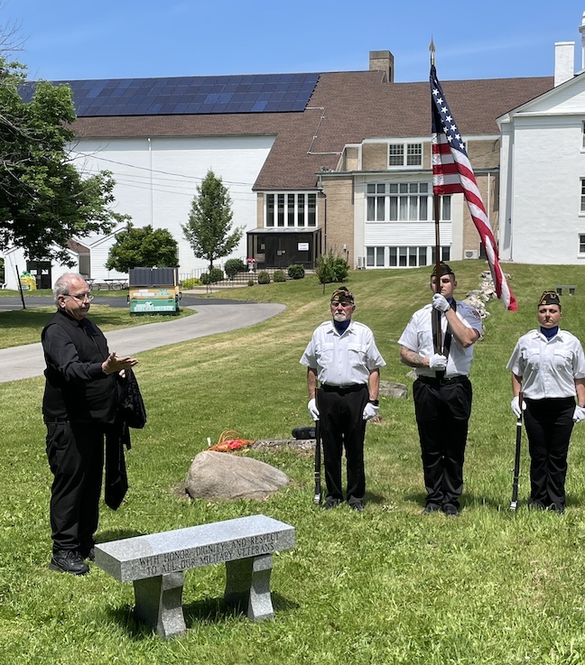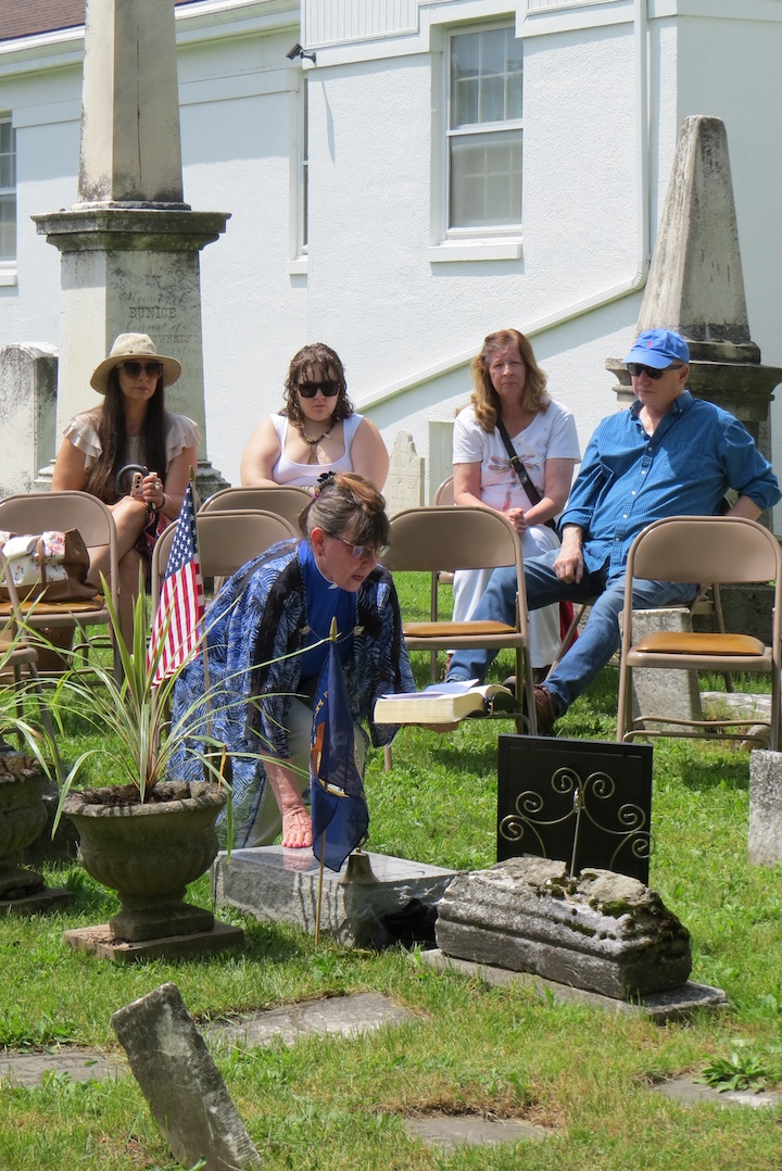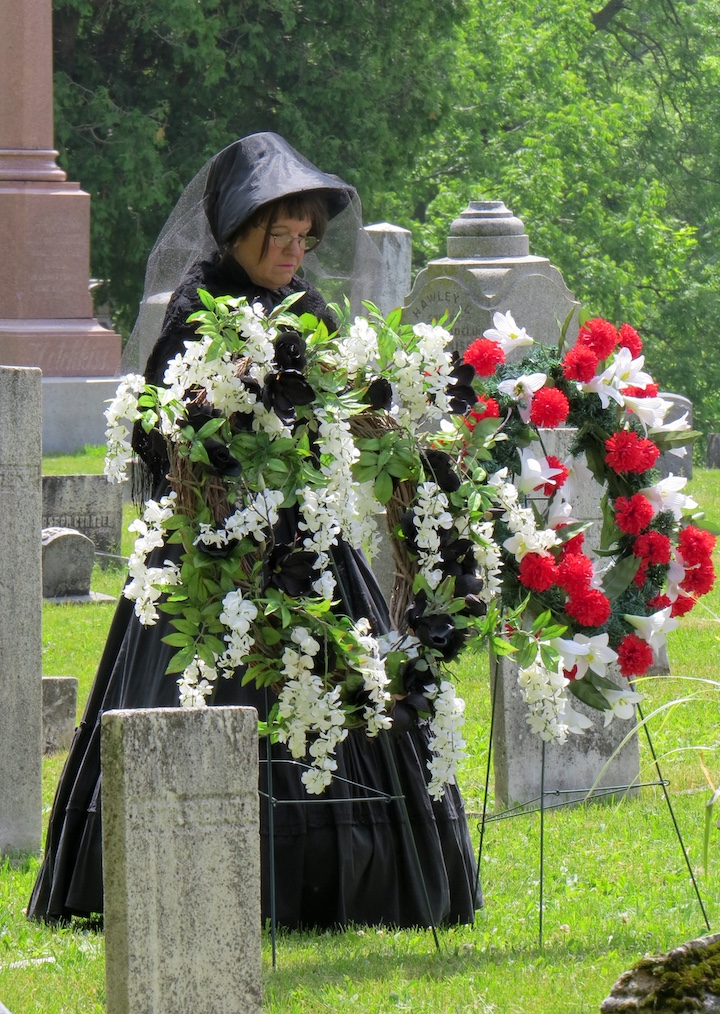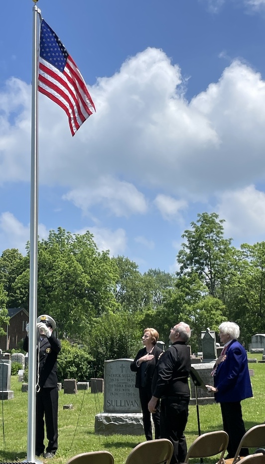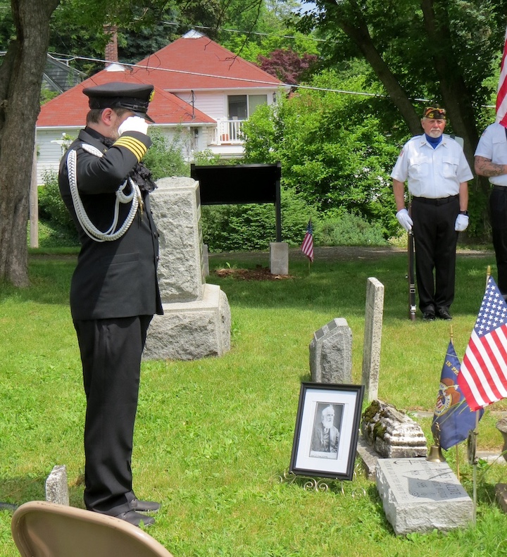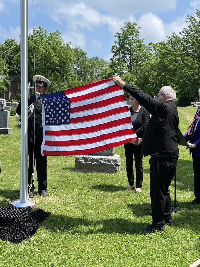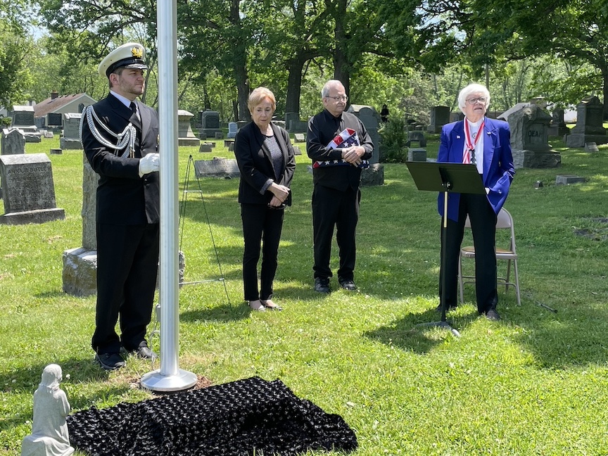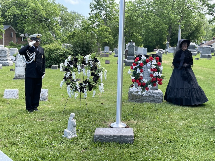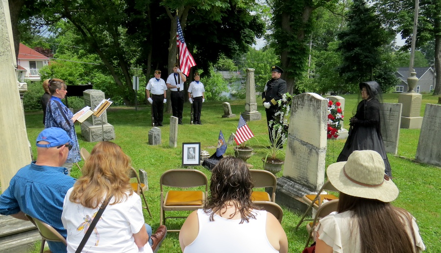 •Sunday afternoon saw two dedications at the Village of Lewiston Cemetery. The first was for the Van Cleve family and featured the undraping of a veterans memorial in the cemetery section next to the old church. Town of Wheatfield Historian Justin Higner portrayed Capt. Van Cleve and told the background story of the Van Cleves. Claudia Werth Carnes portrayed the widow Rev. Mrs. Smith, mourning the Van Cleves and the veterans who have since passed. Later, in the Oakwood section, there was a dedication and blessing of a veterans memorial flagpole and memorial bench. The VFW honor guard was present for the raising of the colors. Village Historian Russ Piper collected the memorial pieces and coordinated the unveiling.