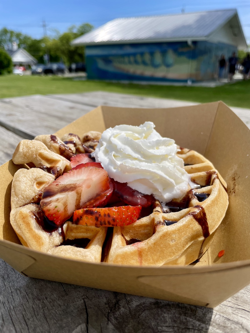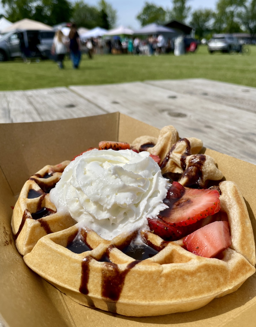 If you’re stopping by the Lewiston Artisan Farmers Market, be sure to try one of the Three Little Hens Baking Co.’s giant, freshly made waffles – served with a choice of delicious toppings.
