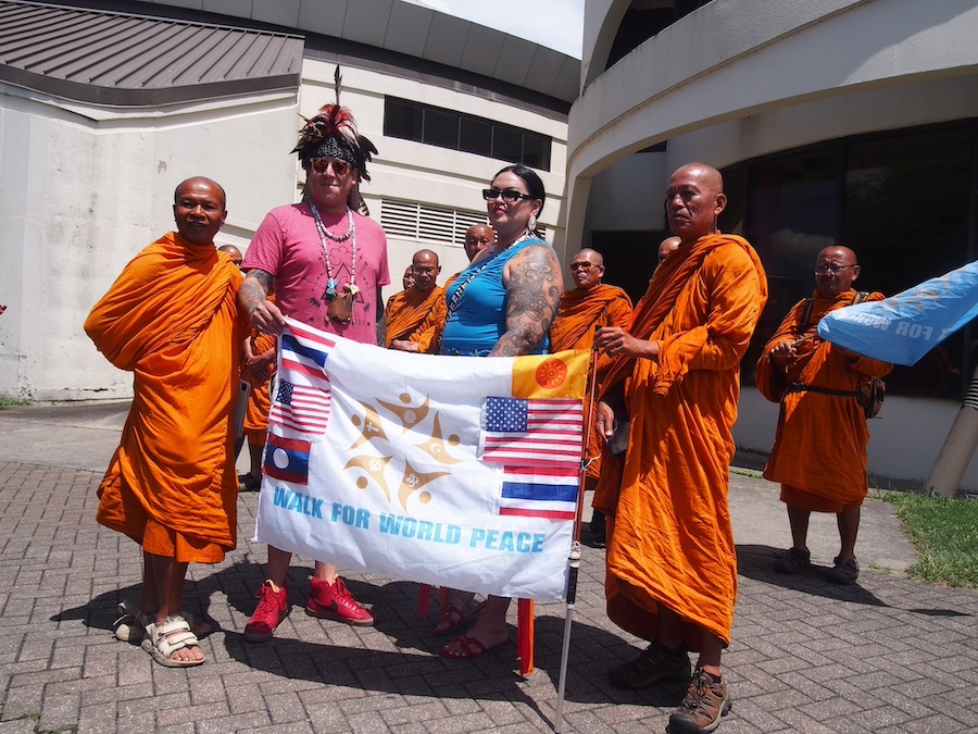 Buddhist monks with Jordan Smith, a member of the Mohawk Nation, at the Turtle on June 27.