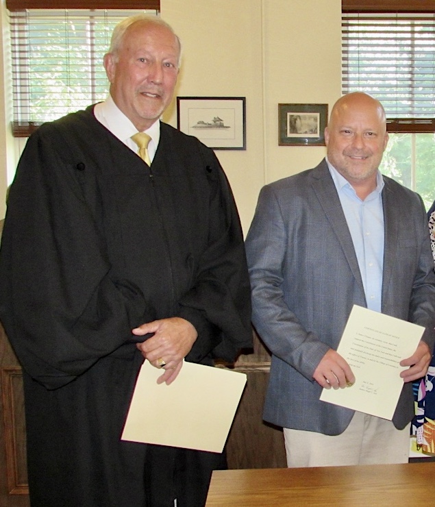 The Hon. Hugh Gee administers the oath of office to Village of Lewiston Trustee Jim Fittante.