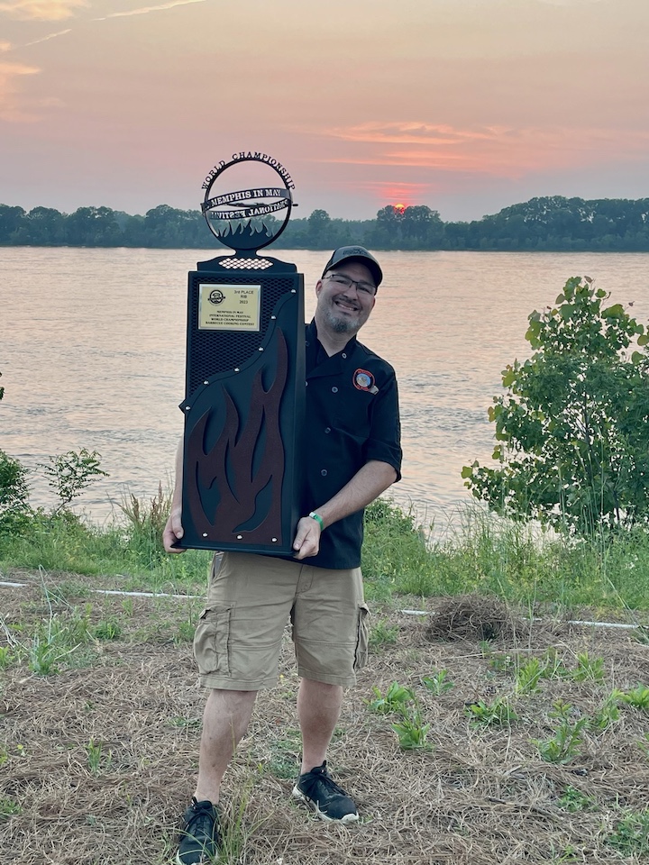 Barbecue pitmaster Neil Gallagher poses with the trophy he received for his team's third place win in the ribs category of the 2023 Memphis World Championship Barbecue Cooking Contest. (Submitted photo)