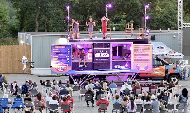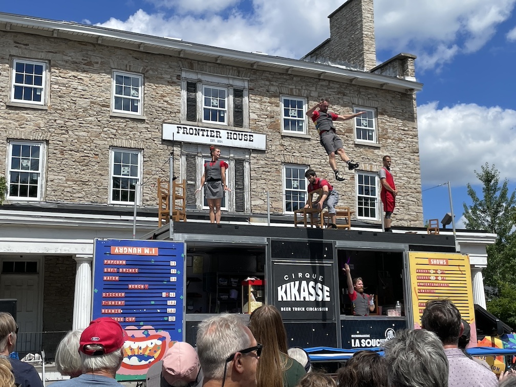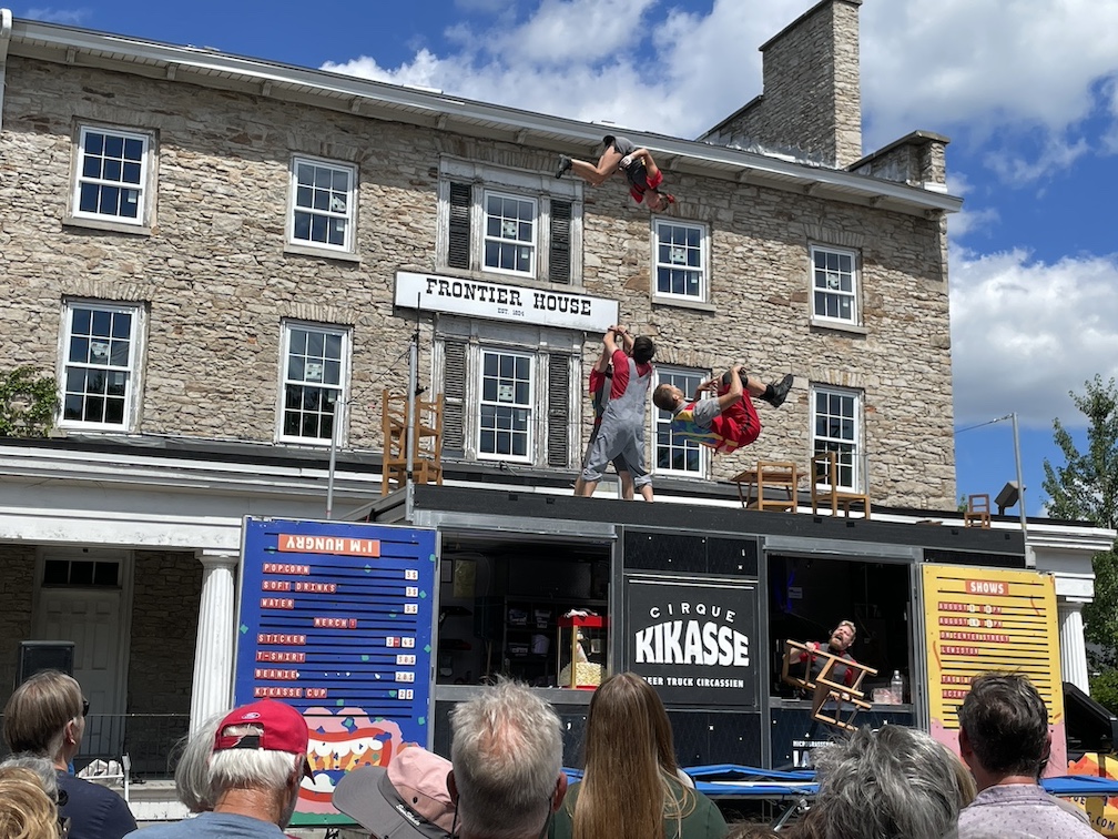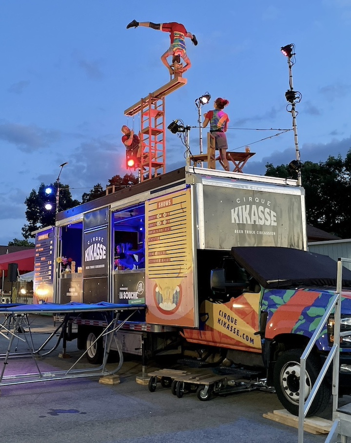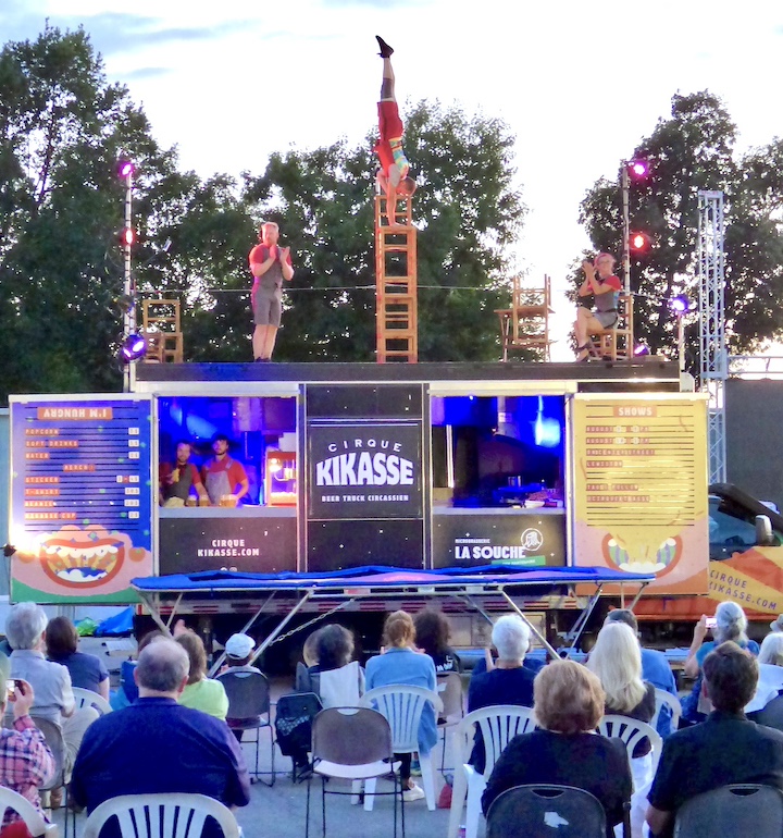 Later that evening, the Montreal-based Cirque Kikasse troupe of high-flying acrobatics entertained an enthusiastic audience inside the Artpark Amphitheater with a dazzling street-level show. Performers paired balance and trampoline skills … with snacks and beverages, which they served postshow from their stage/street truck!