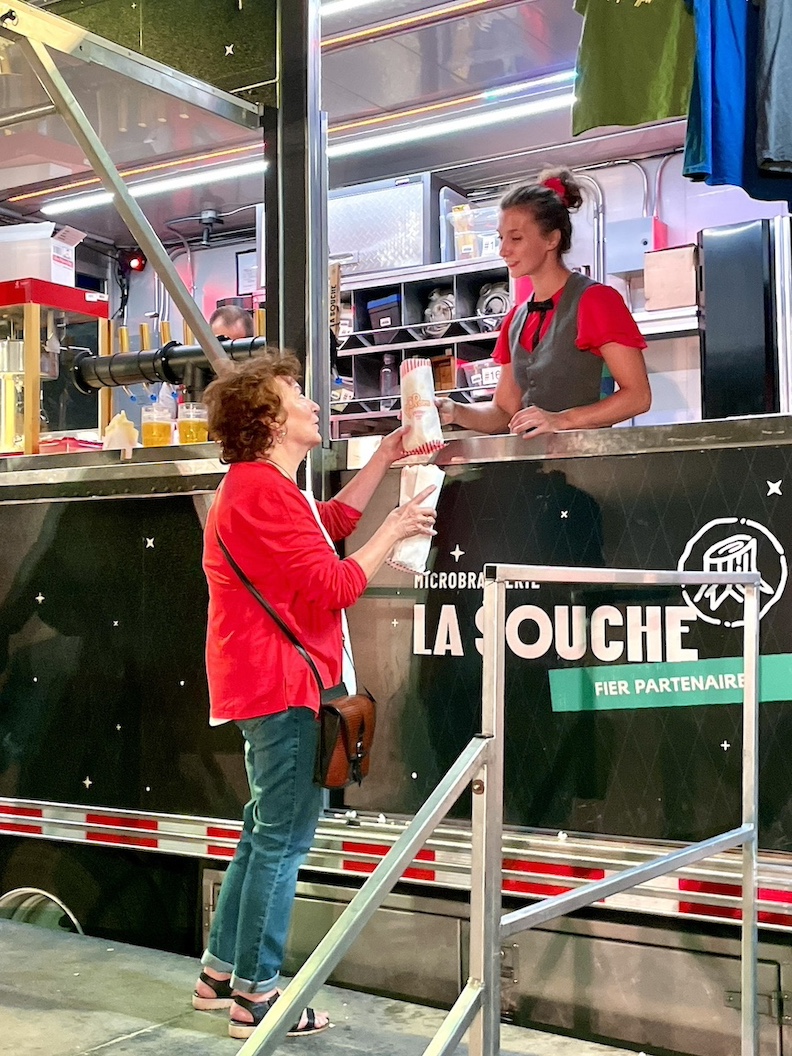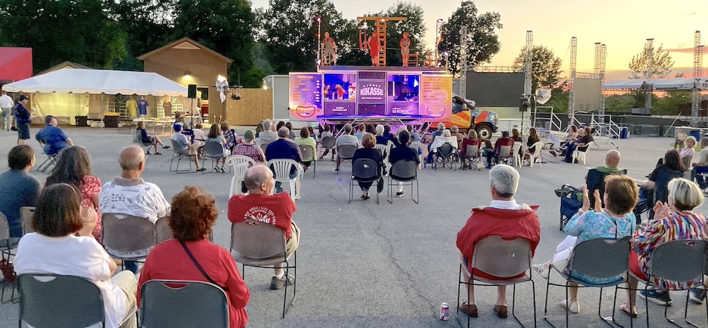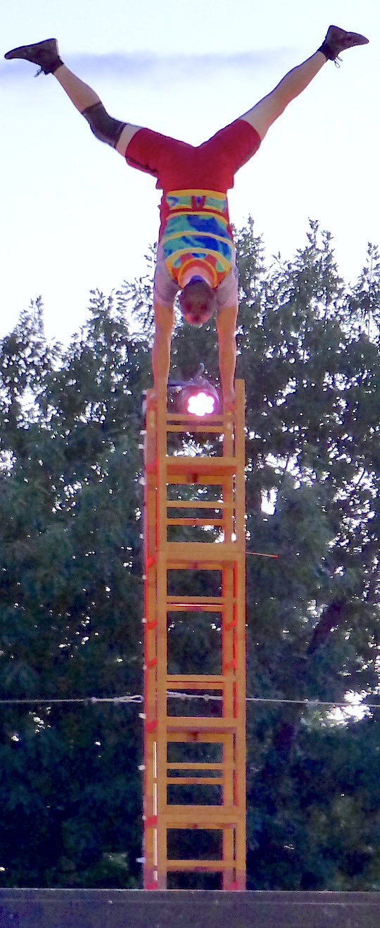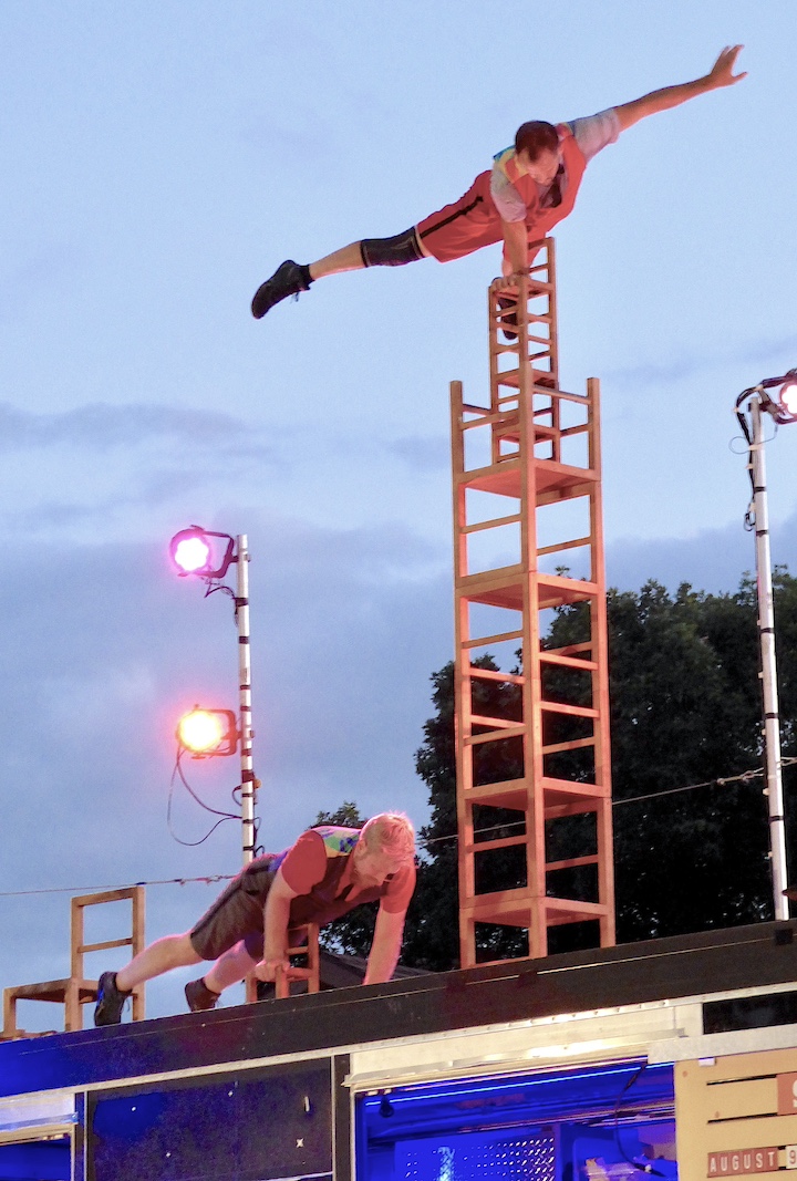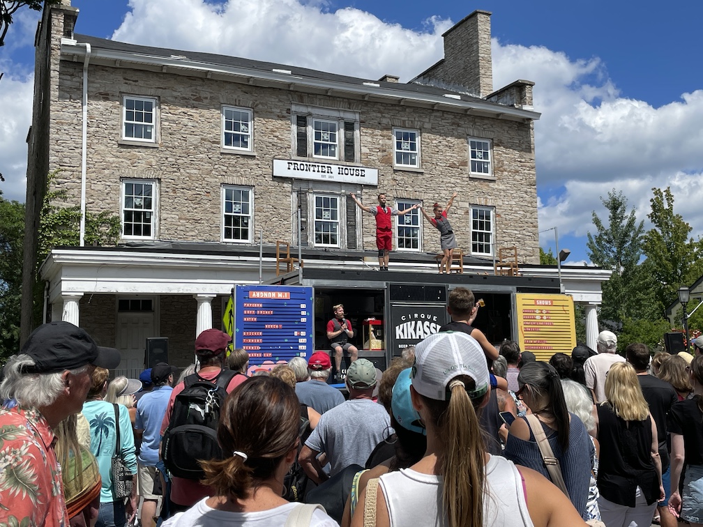 Later that evening, the Montreal-based Cirque Kikasse troupe of high-flying acrobatics entertained an enthusiastic audience inside the Artpark Amphitheater with a dazzling street-level show. Performers paired balance and trampoline skills … with snacks and beverages, which they served postshow from their stage/street truck!