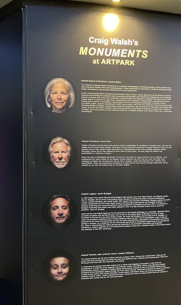 The faces were selected to honor Artpark’s Indigenous neighbors, stage crew, staff, volunteers, board of directors, legacy and artists, in addition to New York State Parks, and patrons past, present and future. Honorees include Violet Printup, Jack Wrobel, Susan Stimson, Bruce Boe, Joanne Bauer, Jason Brydges, Alison Lytle, Vincent Iacovitti and Juniper DiGesare.
