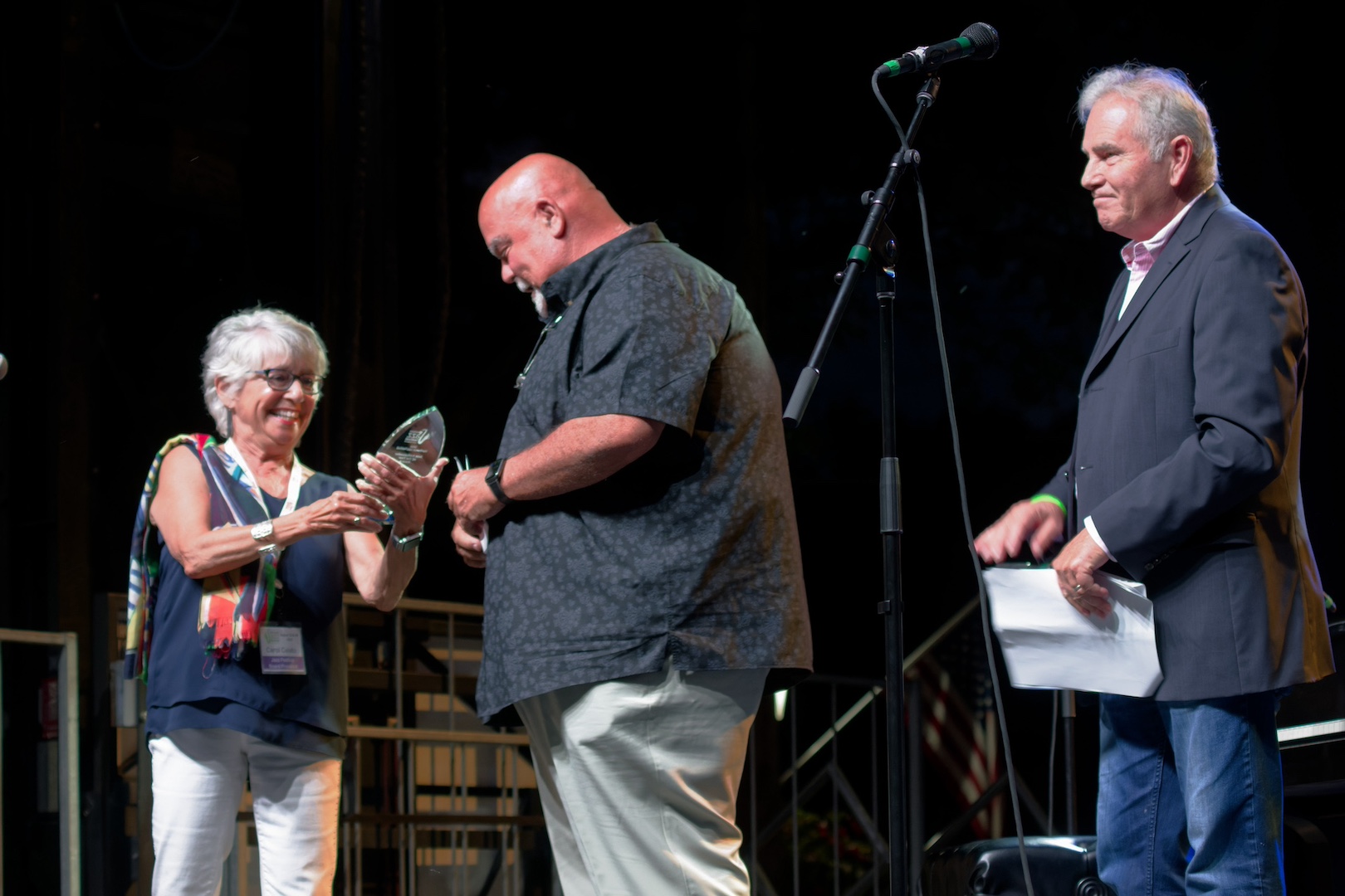 Northwest Jazz Festival Board Chairwoman Carol Calato presents longtime Jazz Festival volunteer Jeff Jordan with the Jazz Festival Ambassador Award. (Photo by Wayne Peters)