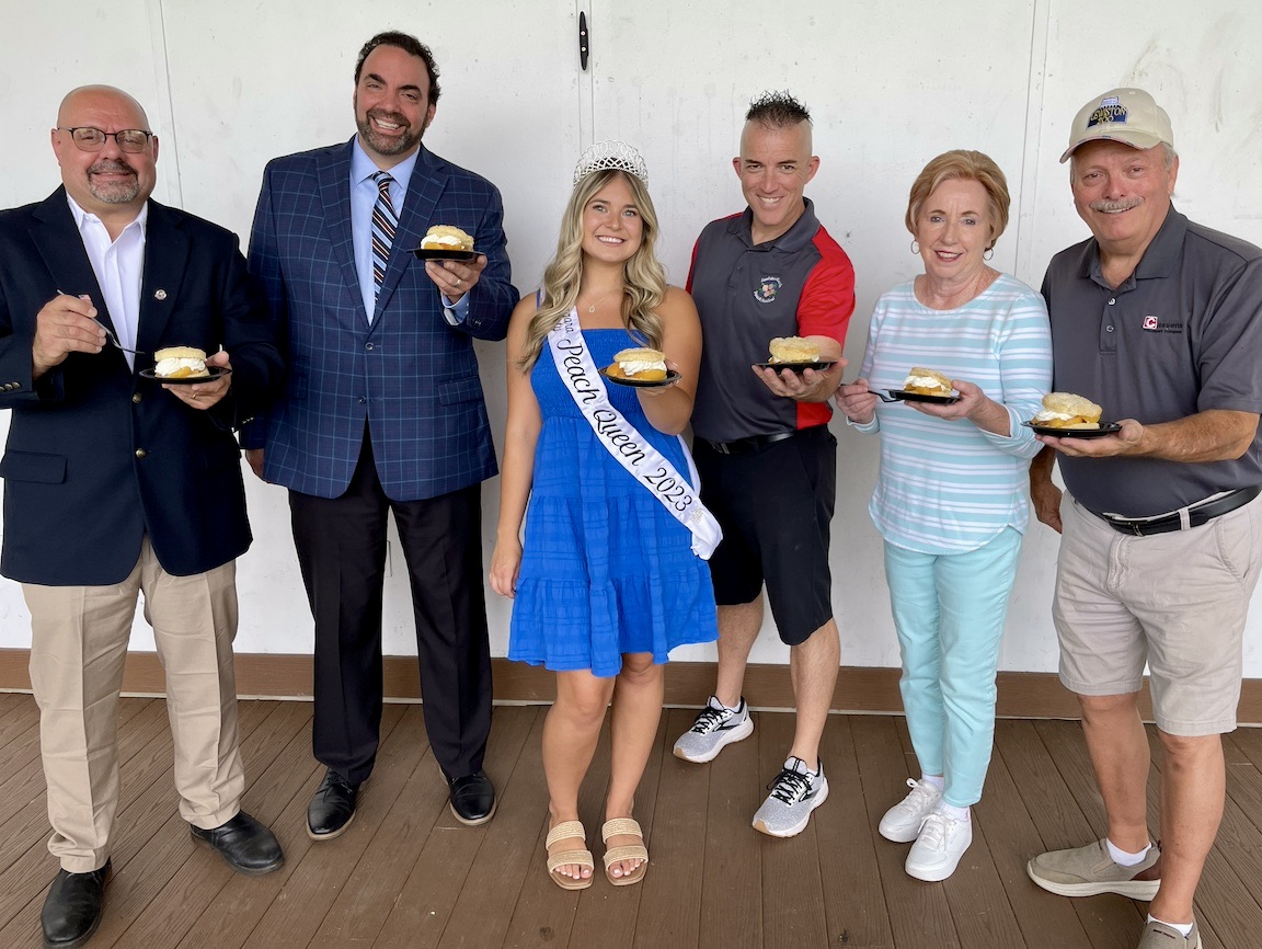 Pictured at the Niagara County Peach Festival kickoff press conference are, from left, event chairman Mark Briglio, incoming president Tom Fontana, Peach Queen Kirsten Ferree, former president Marty Pauly, Village of Lewiston Mayor Anne Welch and Deputy Mayor Vic Eydt.