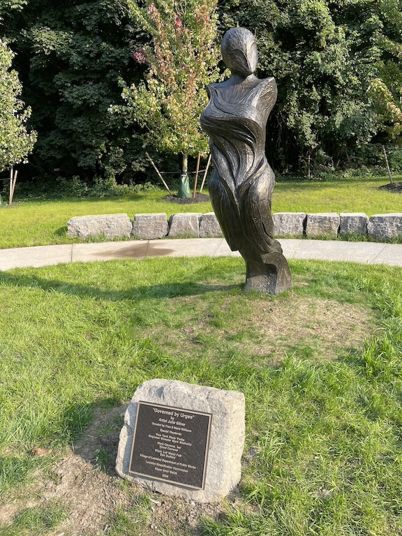 “Governed by Urges” was created by artist Julie Silver and had been located at the Lewiston home of Fran and Marie Williams. A new pocket park was built to accommodate the bronze work, which was donated to the village and will now serve as a more fitting entry point to the performing and visual arts campus.
