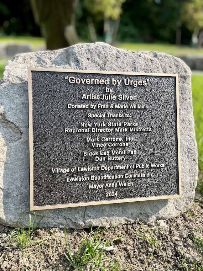 Silver said, “I am deeply appreciative of Fran and Marie Williams for commissioning this sculpture so many years ago and for being longtime supporters of my artwork. Their generous donation of ‘Governed by Urges’ to the Village of Lewiston was the catalyst for this wonderful collaboration between New York State Parks, Artpark, the Village of Lewiston and countless other companies and individuals that donated their valuable time and resources.