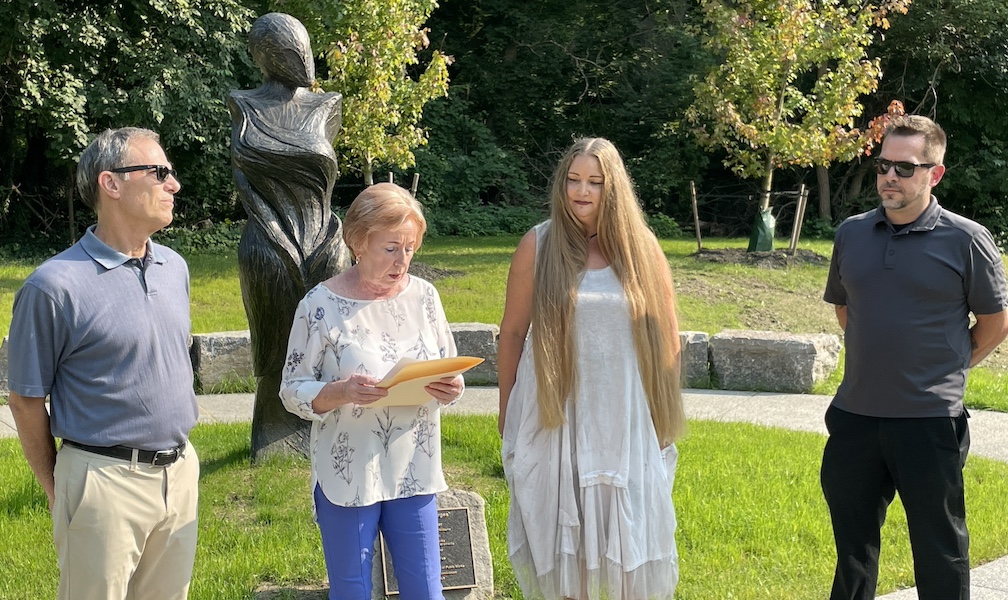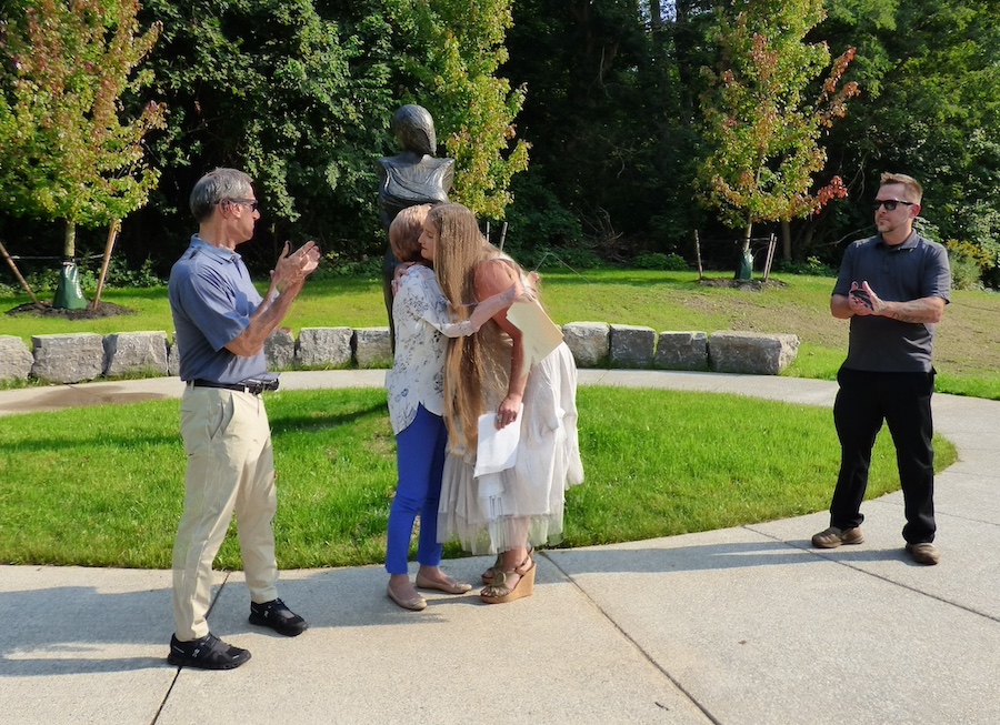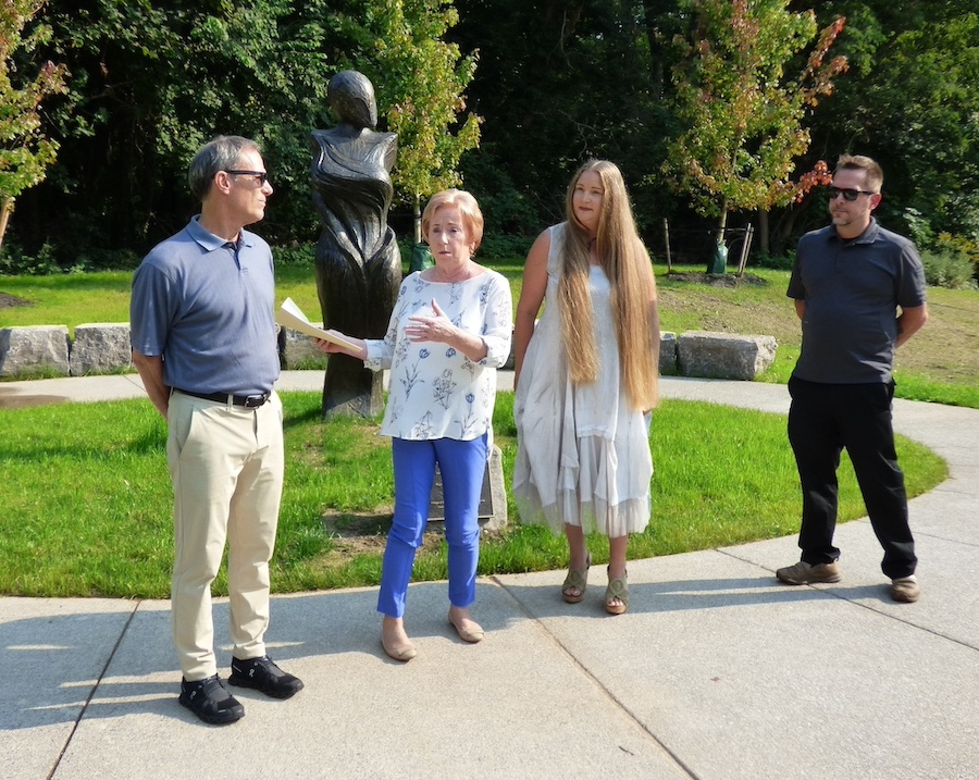 Mayor Anne Welch addresses the crowd – and is embraced by Julie Silver – at the dedication ceremony. Also joining in are Mark Mistretta and Dan Buttery.