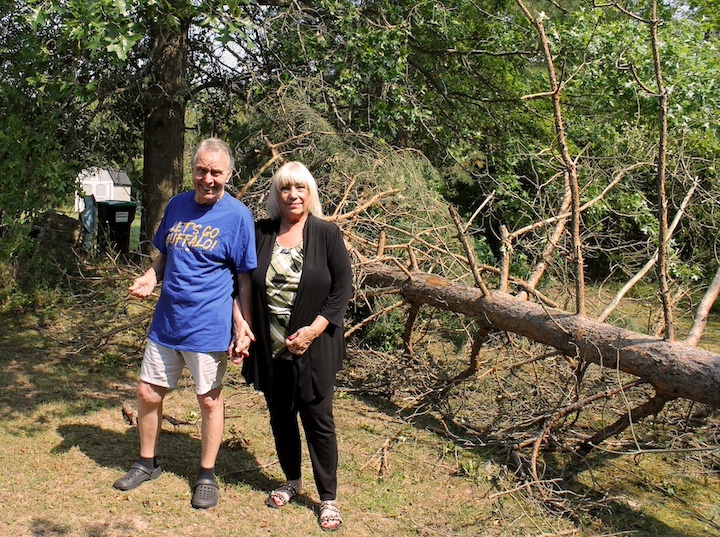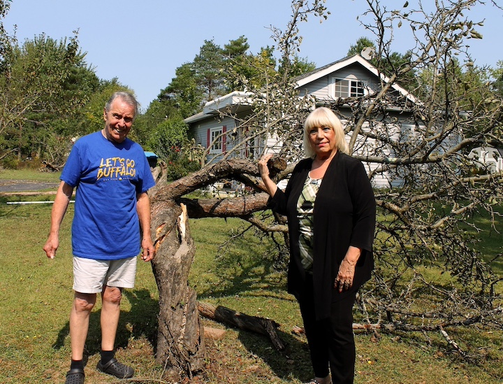 Josie and Jack Young stand in front of the apple tree that was downed by the Sept. 9 tornado that swept by their home on Second Street near West River. The Youngs lost five trees to the tornado.