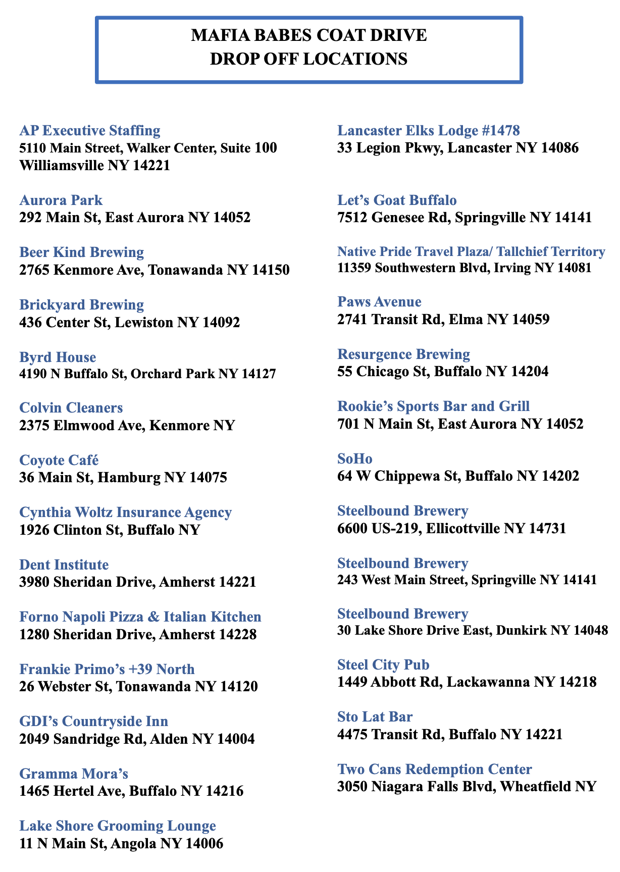 The Mafia Babes have established locations throughout WNY where winter coats and accessories for kids and adults can be donated through Oct. 31. A list of those locations is on its Facebook page. Additionally, since many Mafia Babes live outside of both WNY and the U.S., organizers have created a link for financial contributions that will be used to purchase coats for this initiative (bit.ly/buffalo-coat-drive). The Mafia Babes have also created a shopping list at Amazon with deliveries going directly to Colvin Cleaners (https://www.amazon.com/hz/wishlist/ls/1HAGZXJZUBFWW?ref_=wl_share).