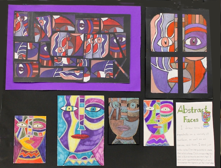 Another section of the display, called “Abstract Faces,” bears images that look like masks. Some faces are segmented in deep colors bordered in black lines to resemble stained glass.