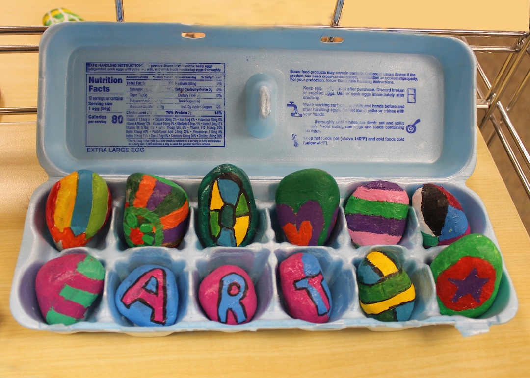 The exhibit has a touch of whimsy, as colorful painted rocks with an ovoid shape sit in an egg carton.