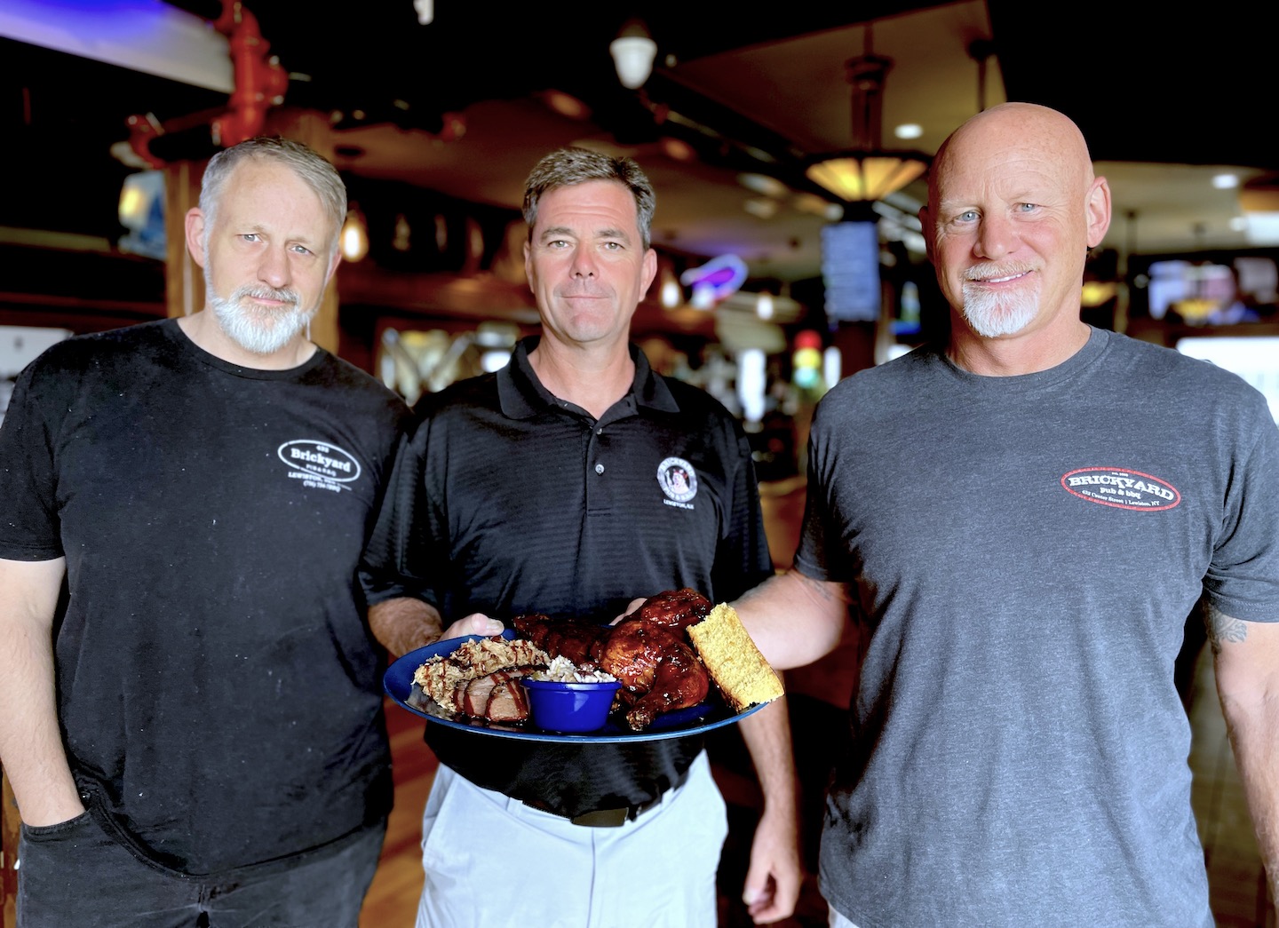 Brickyard owners Eric Matthews and Ken Bryan in the beginning ... on the occasion of their restaurant’s 10th anniversary in 2015 … and with Chief Operations Officer Steve Matthews last summer. They’re shown holding "The Ultimate" platter, which includes a heaping mound of pulled pork, succulent half-rack of St. Louis-style ribs, tender brisket and a savory barbecued half-chicken.