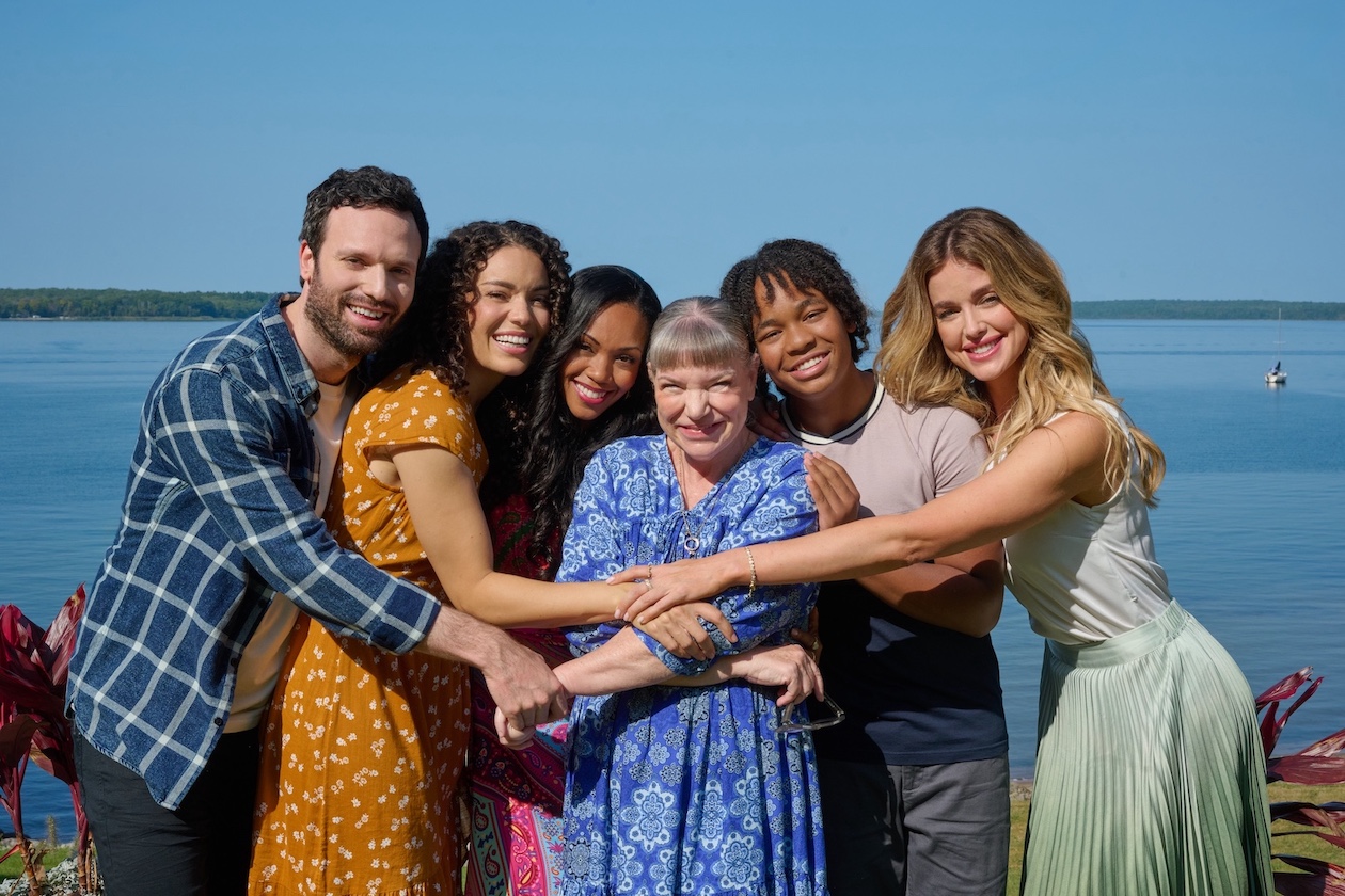 Kathryn Davis, Jake Epstein, Mindy Cohn, Ashley Newbrough, Mishael Morgan and Justice James in “Hearts Around the Table: Jenna’s First Love.” (Credit: ©2025 Hallmark Media/Photographer: Courtesy Brain Power Studio)
