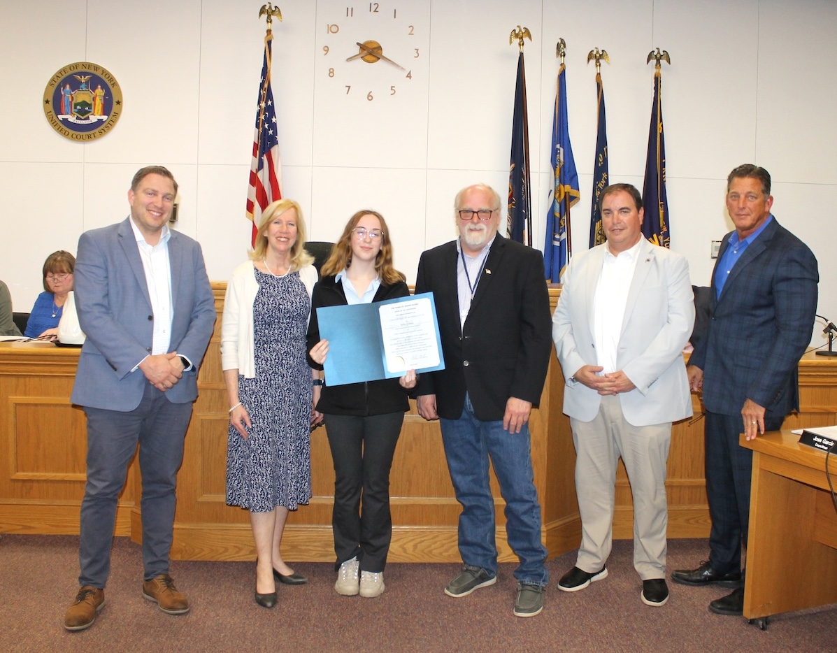 The Town of Grand Island awarded a certificate of appreciation to Grand Island High School student Kaitlyn Wadman at its meeting Monday in appreciation of her completion of the town’s internship program. From left: Council member Tom Digati, Senior Billing Clerk Elaine O’Neill, Wadman, Supervisor Peter Marston and council members Jose Garcia and Dan Kilmer. (Photos by Karen Carr Keefe)