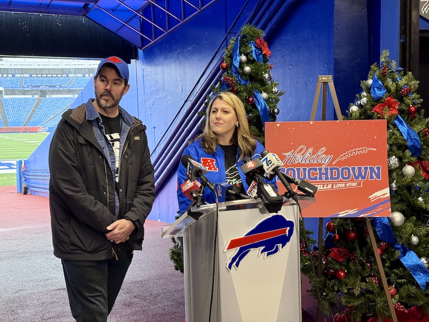 “Holiday Touchdown: A Bills Love Story” Producer Andrew Gernhard and Hallmark Media Senior Vice President of Programming Samantha DiPippo speak to the media at a press conference Thursday at Highmark Stadium.