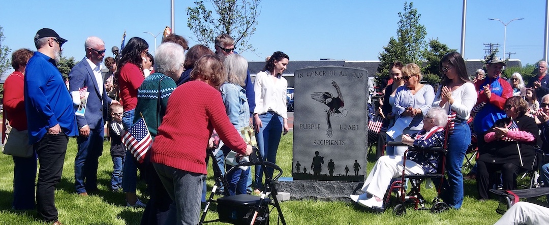 A stone honoring Purple Heart recipients, placed by the Order of the Purple Heart, is unveiled at the DeGlopper Memorial.