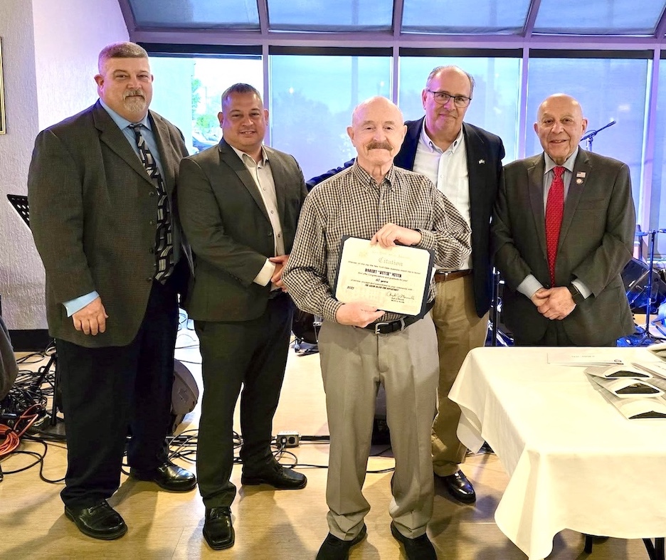 Grand Island Fire Co. officials and Assemblyman Angelo Morinello (right) recognize Ronald “Butch” Meyer for his 60 years of service to the company. (Submitted photo)