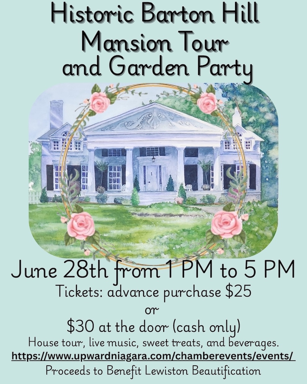 The Barton Hill Mansion Tour and Garden Party takes place from 1-5 p.m. Saturday, June 28. Purchase advance tickets for $25 at www.upwardniagara.com/chamberevents/events/, from a Beautification team member, or at the door for $30 (cash only). All proceeds will benefit Lewiston Beautification.