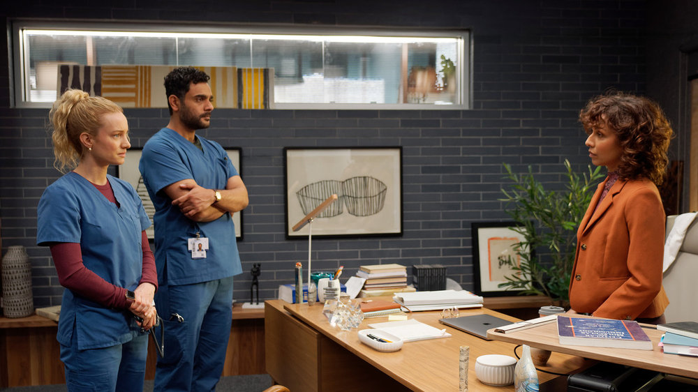 Laurence Leboeuf as Dr. Magalie “Mags” Leblanc, Hamza Haq as Dr. Bashir “Bash” Hamed, and Rekha Sharma as Neeta Devi. (Photo by Yan Turcotte/Sphere Media/CTV)