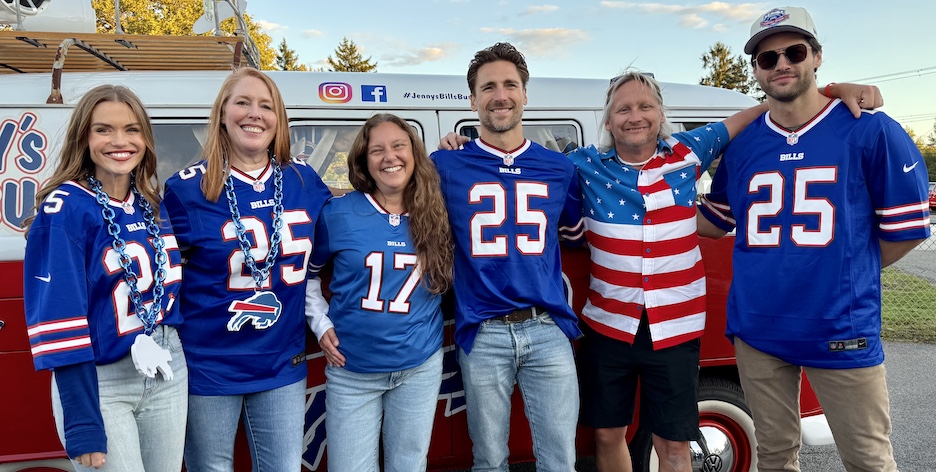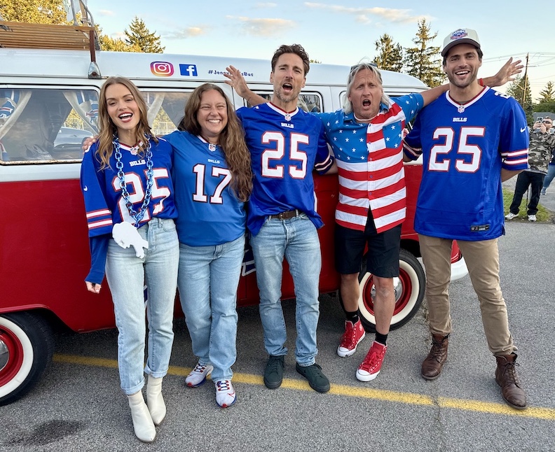"Holiday Touchdown: A Bills Love Story" stars Holland Roden, Andrew Walker and Matthew Daddario are shown with Jenny and Mark Kless of Jenny's Bills Bus.