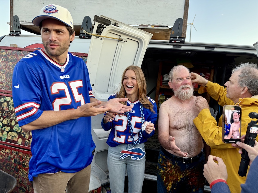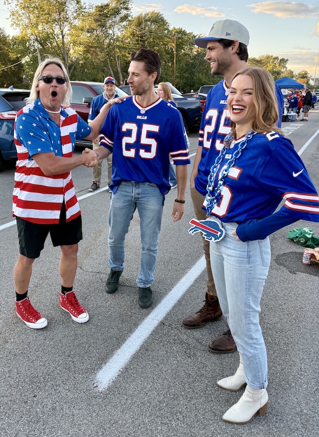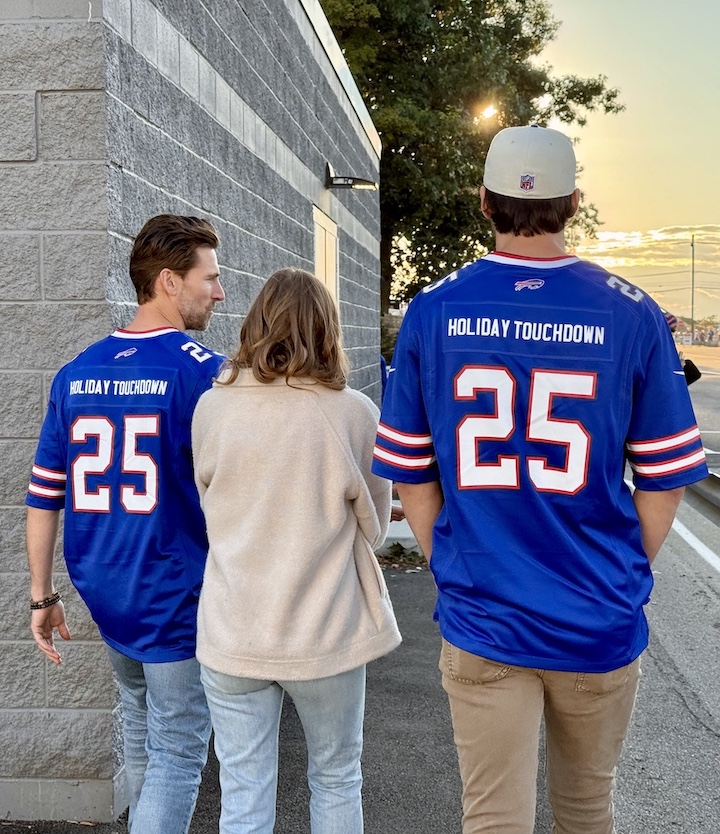 Each of the actors wore a custom-made Buffalo jersey with “Holiday Touchdown” on the back. As they walked the grounds around the former Ralph Wilson Stadium, they took notice of a new home field now under construction – and they often shouted “Go Bills!” in solidarity with their brothers and sisters in red, white and blue.