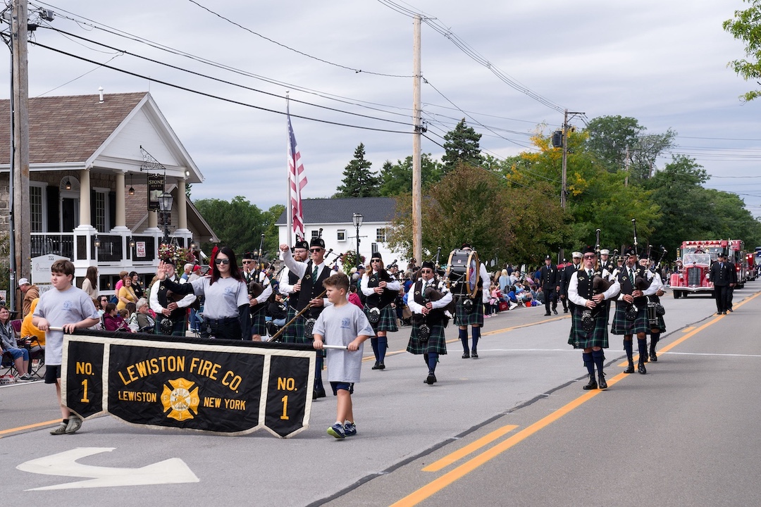 The MacKenzie Highlanders’ Pipes and Drum led the Lewiston Fire Co. No. 1 parade entrants. (Photo by Wayne Peters)