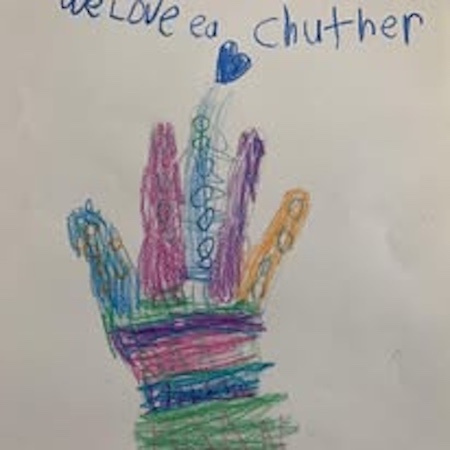 “The last day of the program, we asked the kids to draw something that would remind them of Francis Center, and this sweet little first grader drew this hand with a heart coming out of it that says, ‘We luv ea chuther.’