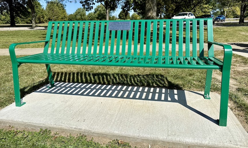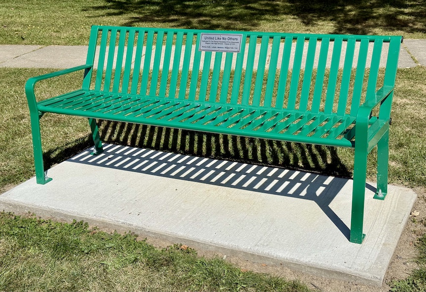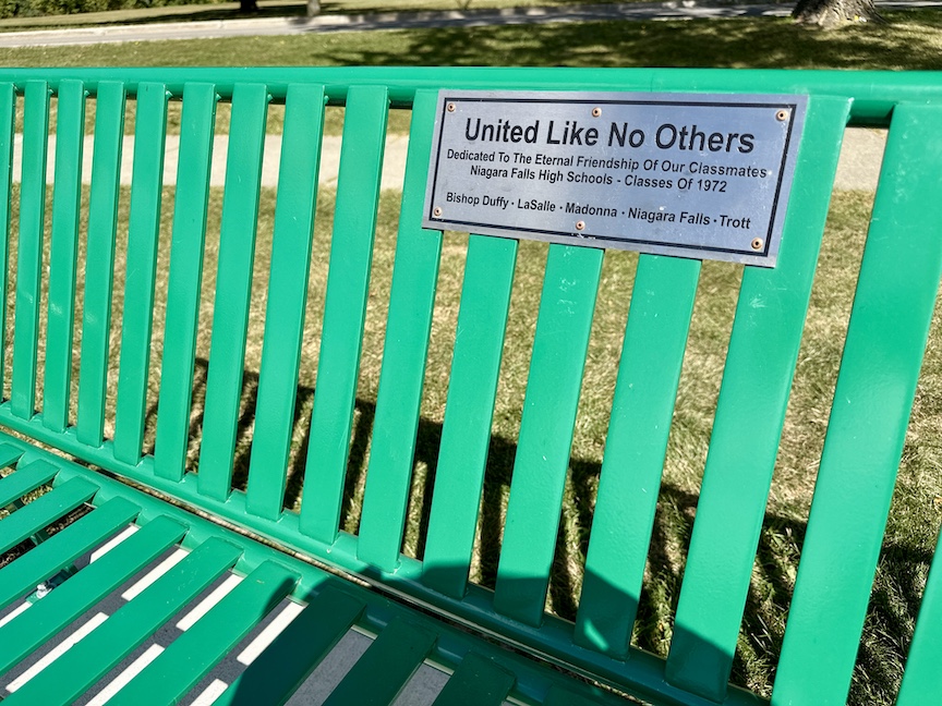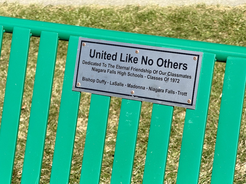 The plaque on the bench reads, “United Like No Others // Dedicated To The Eternal Friendship Of Our Classmates // Niagara Falls High Schools Classes Of 1972 // Bishop Duffy • LaSalle • Madonna • Niagara Falls • Trott.”