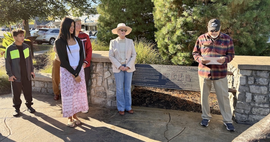 Tom Collister, curator for the Historical Association of Lewiston/Lewiston Museum, speaks Monday at the Tuscarora Heroes Monument as scholarship recipient Anneliese Brayley looks on.