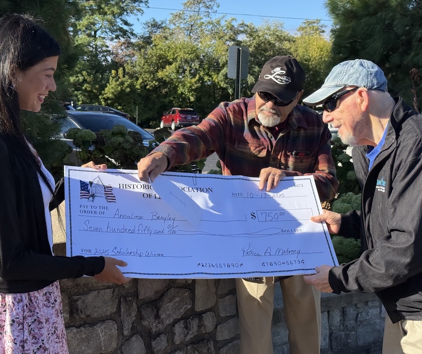 Anneliese Brayley is presented with a scholarship by Tom Collister, curator for the Historical Association of Lewiston/Lewiston Museum; and former Village of Lewiston Mayor Terry Collesano.