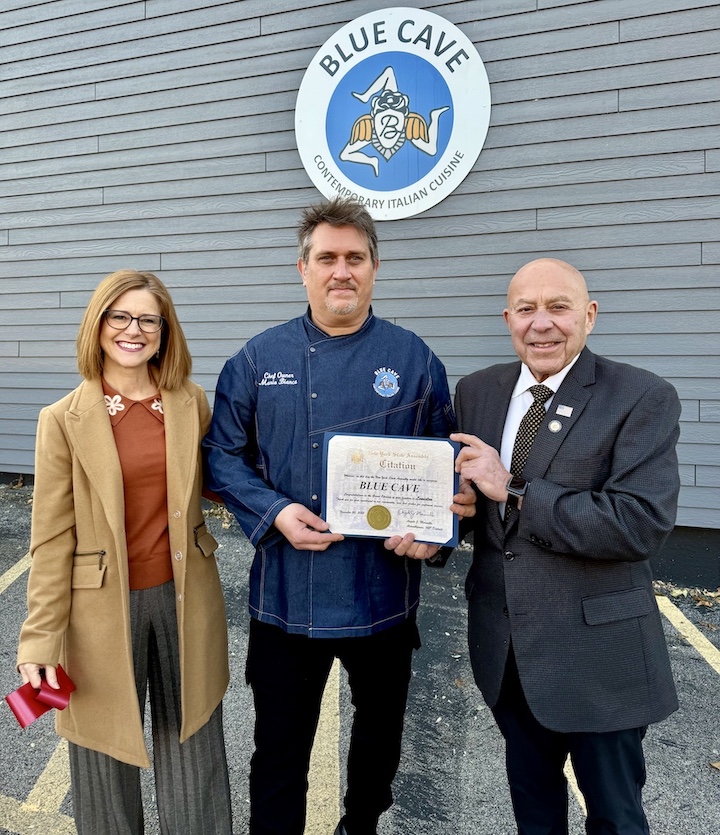 Assemblyman Angelo Morinello presented a proclamation to Blue Cave owners Pamela and Mario Bianca.