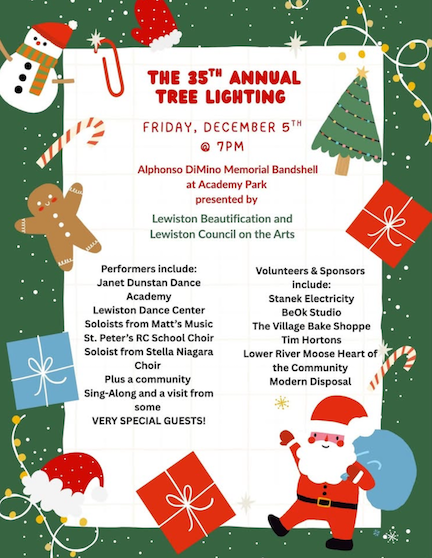 Once again, Village of Lewiston Beautification Committee and the Lewiston Council on the Arts are joining forces to host the Lewiston tree-lighting at the Alphonso I. DiMino Memorial Band Shell in Academy Park. The 35th annual event (formerly held at Hennepin Park) begins at 7 p.m. Friday, Dec. 5.